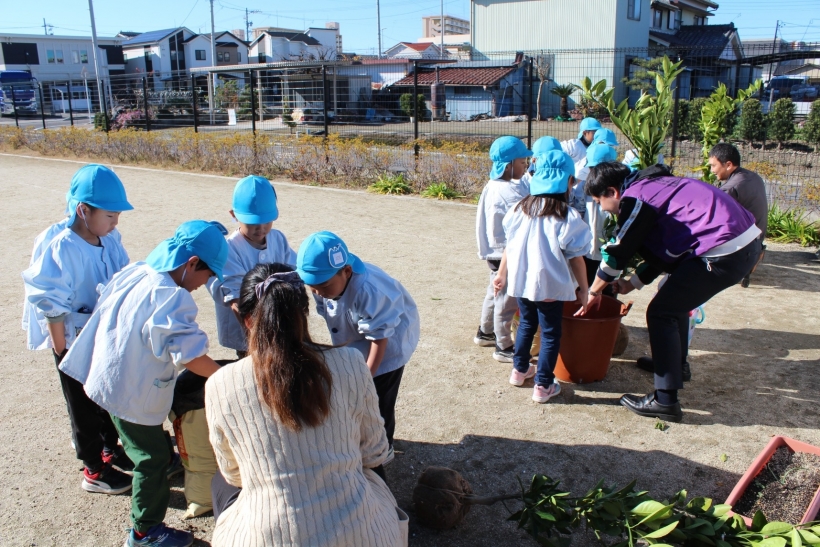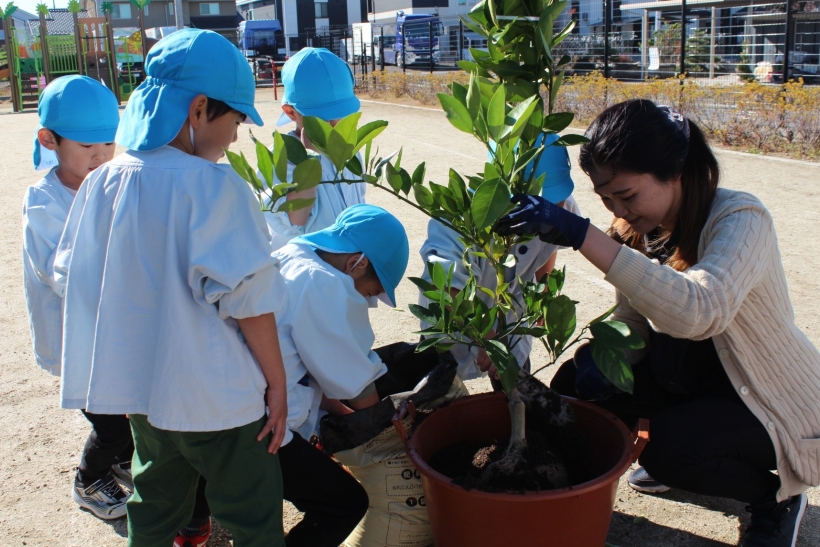 名古屋市環境局の方と一緒に、みかんの木を植えました。