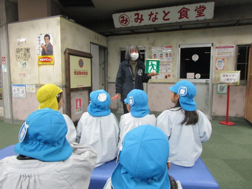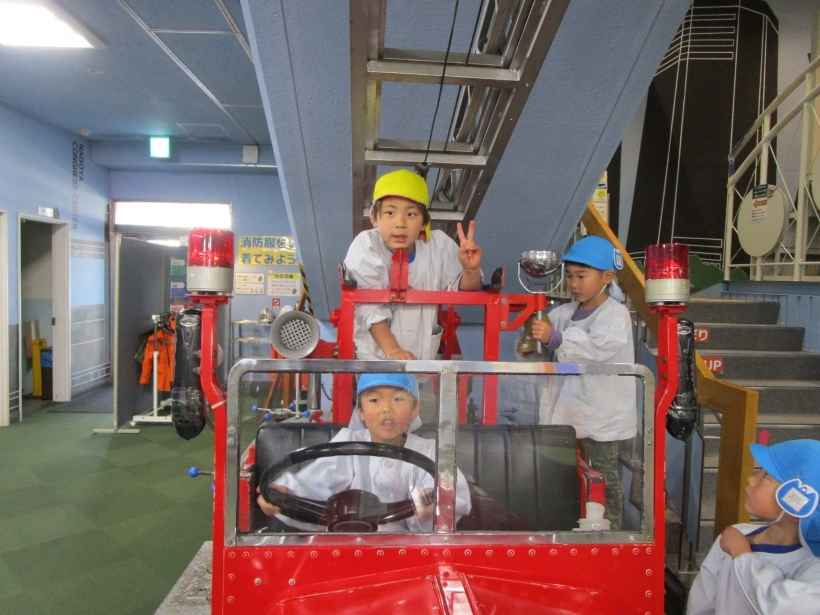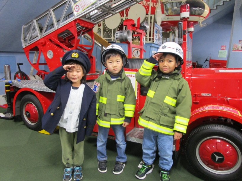 港区防災センター見学【ぞう組】 港区防災センターへ出掛けました。 消防士の服を着たり、昔の消防車に乗ったりしました。 災害について話を聞き、震度7の地震や、火災時の避難を実際に体験しました。 災害の怖さを感じながらも、良い経験ができました。 消防ヘリコプターにも乗りました。 操縦席にメーターやスイッチがたくさんあることに驚いていました。 普段できない経験ができて、喜んでいた子どもたちでした。 少し港図書館にも寄って、楽しいお出掛けになりました。