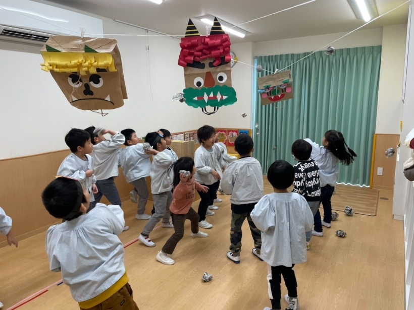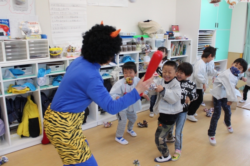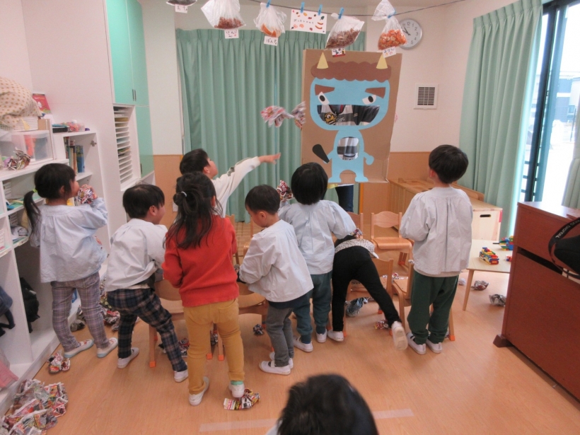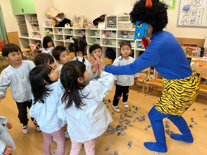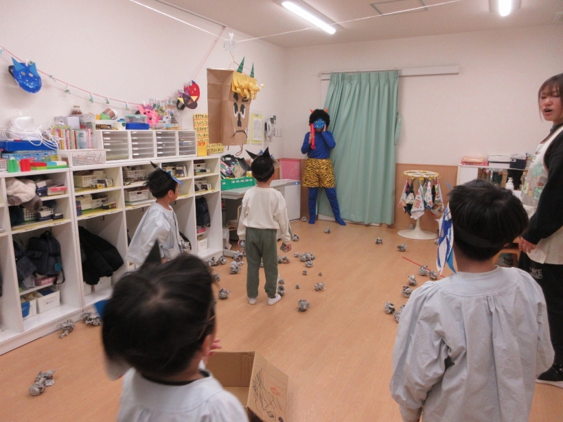 保育室に現れた青鬼に、「おにはそと!ふくはうち!」と声を出しながら新聞で作った豆を投げていました。