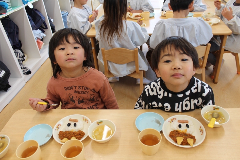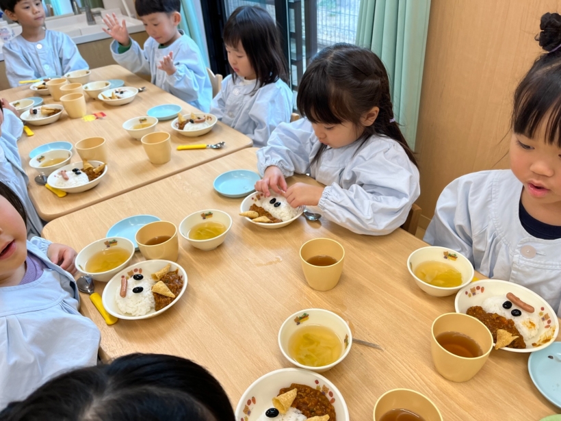 子どもたちは黒豆やウインナーを使って思い思いに鬼の顔を作り、楽しんで食べていました。