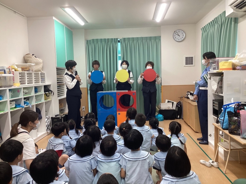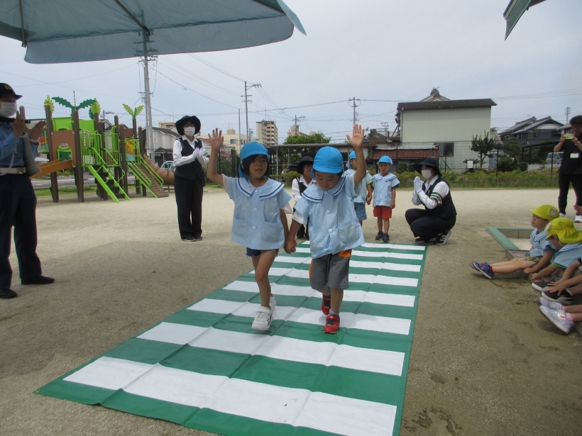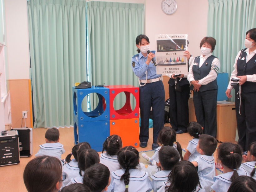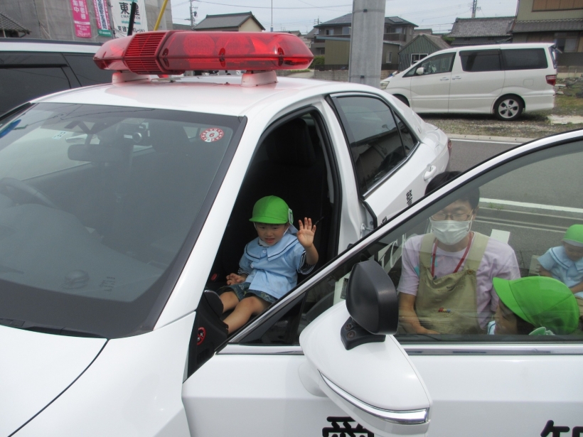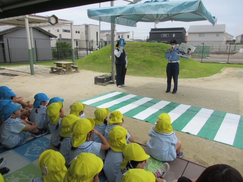 交通安全教室【ぞう組・きりん組・ぱんだ組】 警察官や交通指導員の方に来ていただき、交通ルールや交通安全についての話を聞きました。 信号の話や、暗い道の危険についてなど、子どもたちは興味津々に聞いていました。 室内で話を聞いたあと、園庭で横断歩道を渡る練習をしました。 「信号が青になったら渡ろう」「右みて、左みて、右みて進む」など、大事なルールを確認しながら手を挙げて、渡っていました。 パトカーと一緒に写真を撮ったり、パトカーに乗せてもらったりして、子どもたちは大喜びでした。 ご家庭でも、交通安全についてぜひ話題にしてみてください。