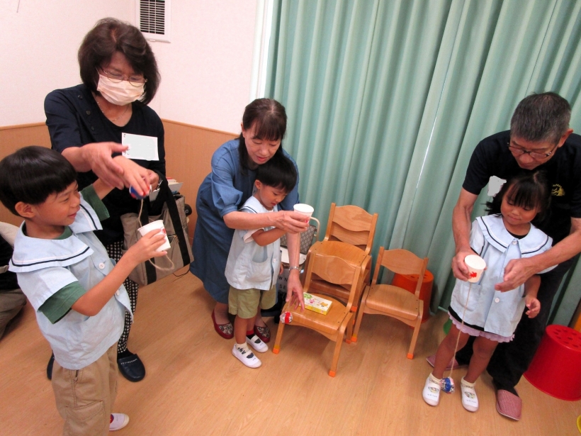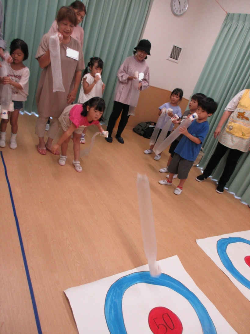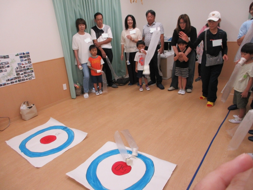 コップに新聞紙で作った玉を入れることが難しかったようですが、祖父母の方と一緒にチャレンジして成功すると、とても喜んでいました。