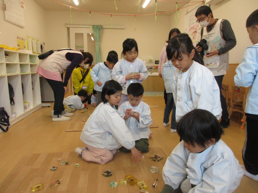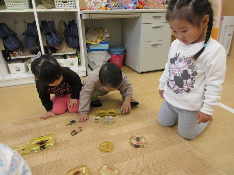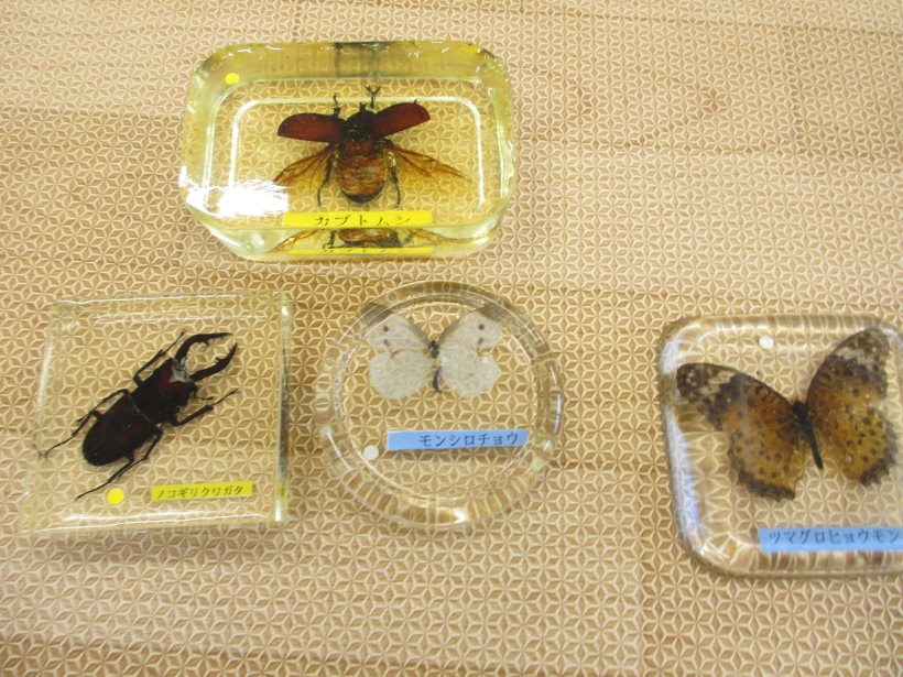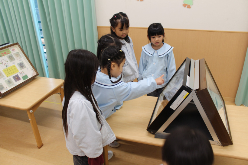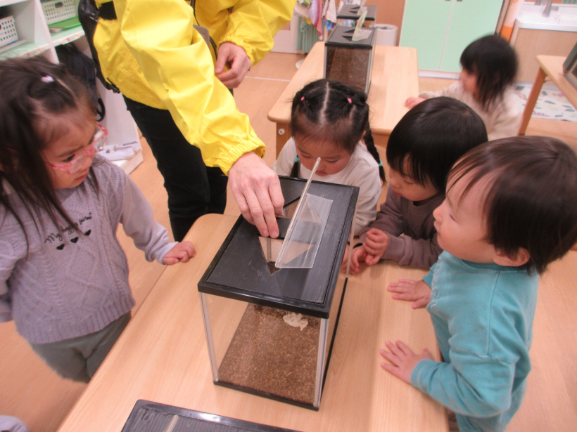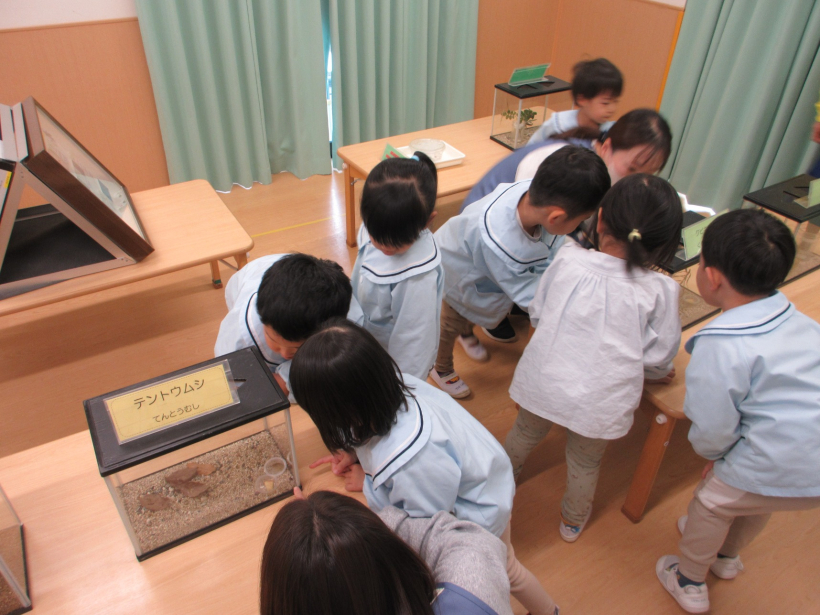 おじゃまむしキャラバン【ぞう組・きりん組・ぱんだ組・うさぎ組】 おじゃまむしキャラバンがやってきました。 たくさんの虫や、標本を見せてもらいました。 子どもたちは、飼育ケースの中で動いている虫をじっくりと観察していました。 てんとう虫など身近な虫も、ナナフシなど初めて観る虫もいて、興味津々でした。 本物の虫を樹脂で固めた「樹脂標本」もたくさん持ってきていただきました。 虫を触ることが苦手でも、樹脂標本は触ることができて、喜んでいました。 たくさんの虫と触れ合うことができて、貴重な体験となりました。