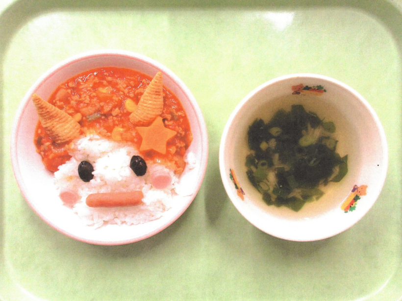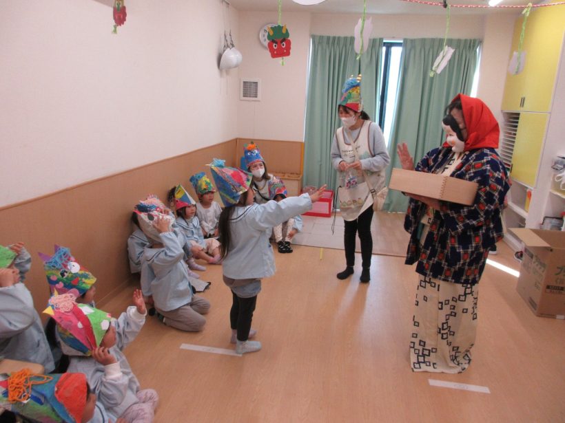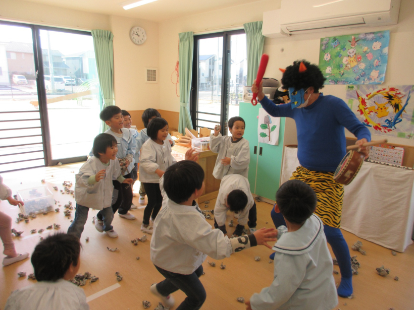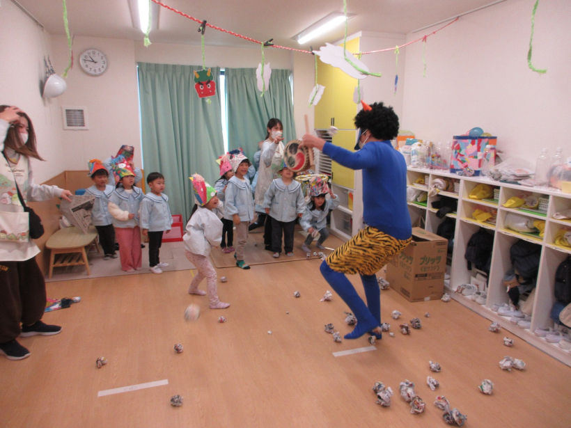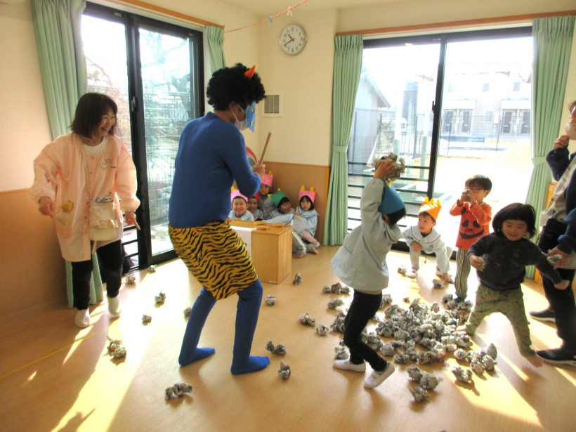 豆まきをしたよ!【ぞう組・きりん組・ぱんだ組】 幼児クラスで、節分の豆まきをしました。 保育士が鬼の格好をして現れると、驚きながらも、「おにはそと!」と元気に新聞紙を丸めた豆をまいていました。 鬼を追い払ったあとは、福の神がやってきました。 豆に見立てたお菓子をもらい、みんなで食べました。 給食は、「オニライス」でした。 かわいい鬼の顔をしたドライカレーを、喜んで食べていました。 今年も一年、ちゃやひるず保育園の子どもたちとご家族の皆さんが、健康に過ごせますように。