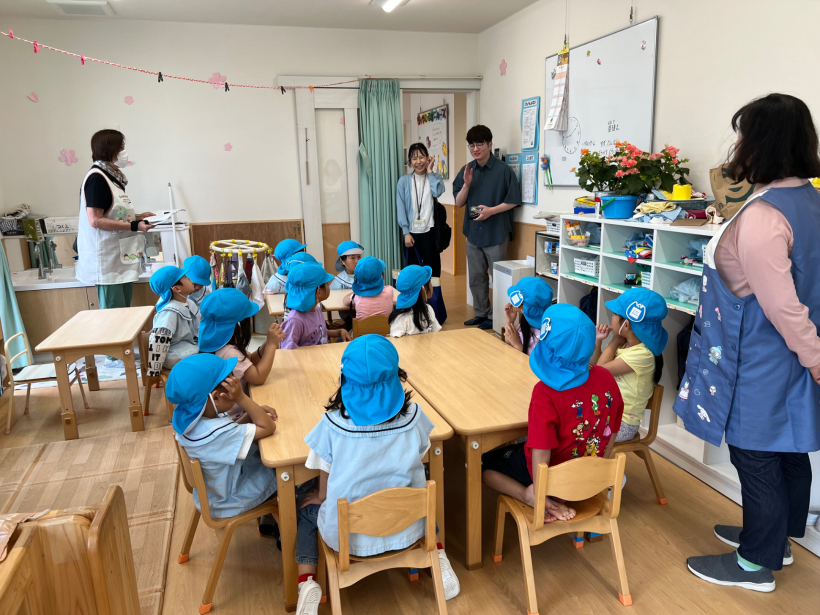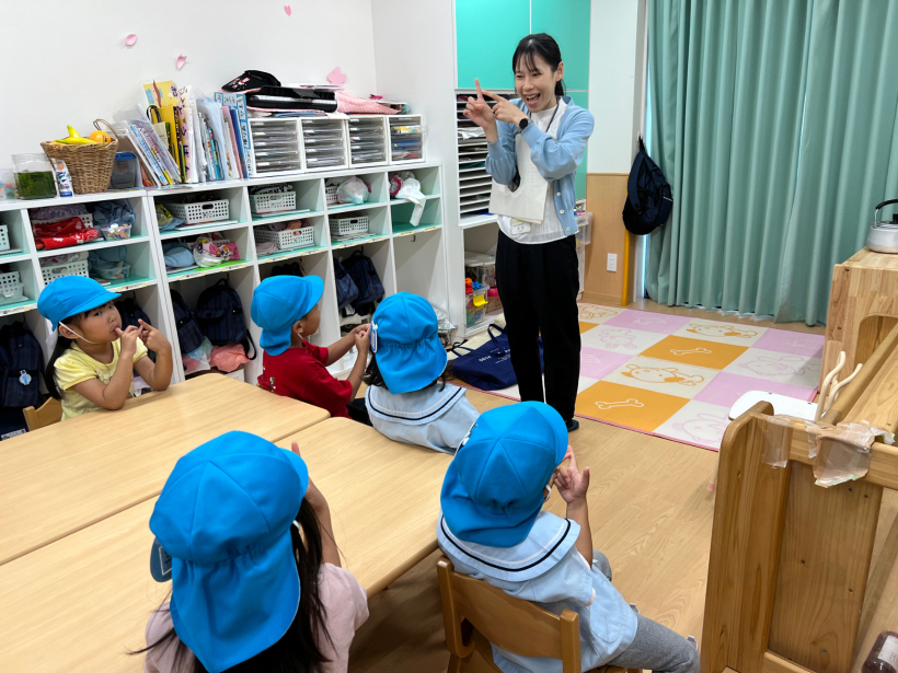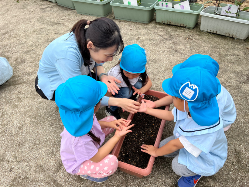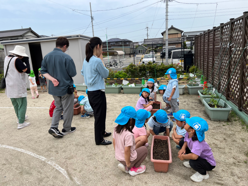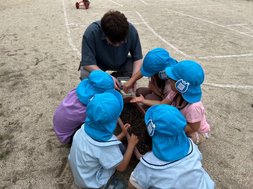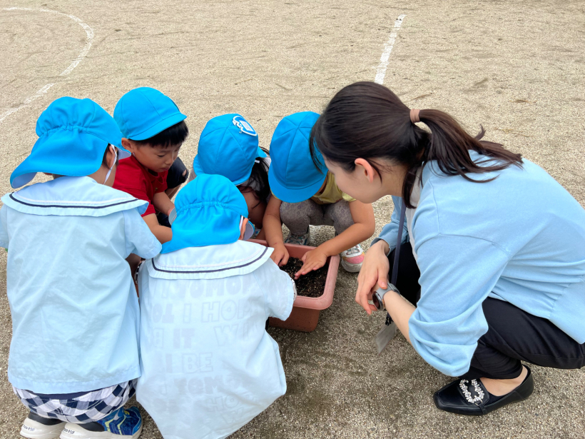 アサガオの種まき 名古屋市環境局の方に来ていただき、アサガオの種まきをしました。 なんとこのアサガオは、空気の綺麗さで葉っぱの色が変わるそうで、子どもたちは真剣に話を聞いていました。 1人1粒、種をもらってさっそく挑戦です! 指で土に穴をあけて種をまいたら、優しく土をかぶせていました。 アサガオの水やりは当番の子がしてくれる事になりました。
