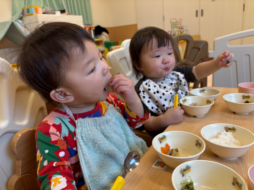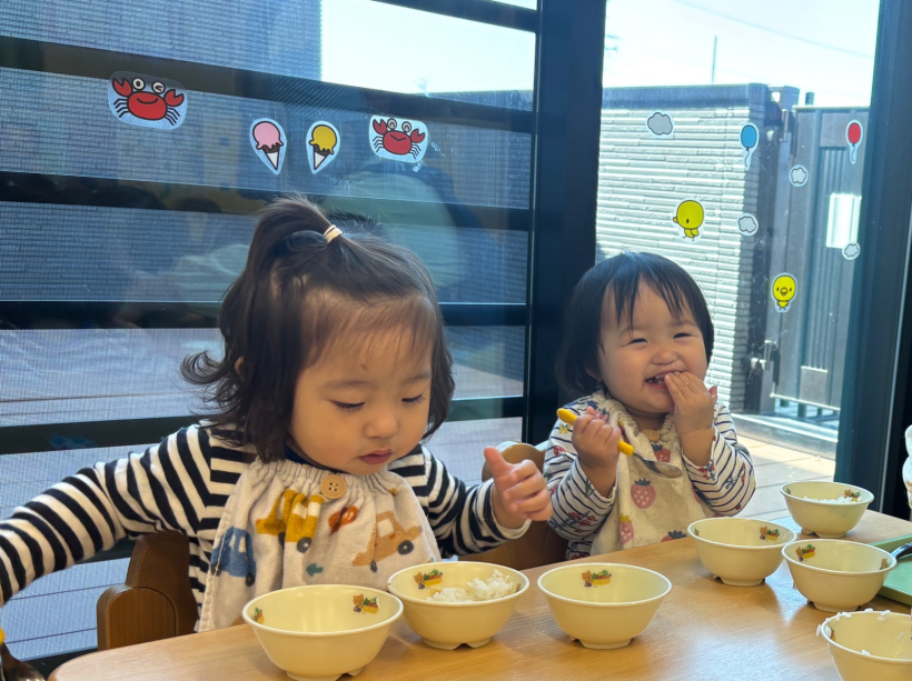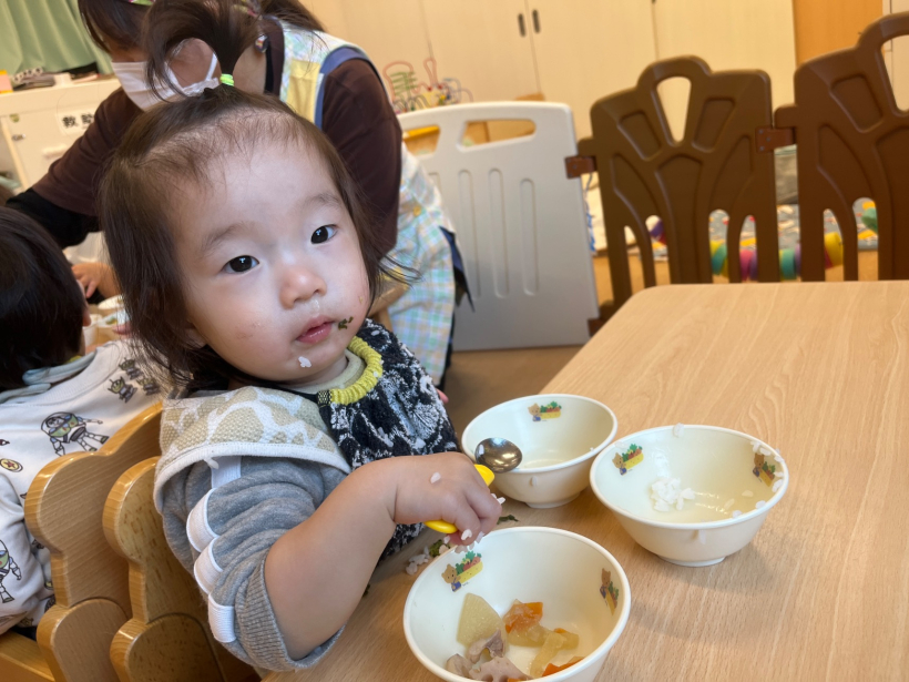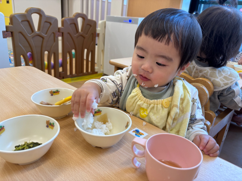 給食では、手づかみやスプーンを使って自分で食べる事が出来るようになり、「自分で食べたい!」という意欲が見られるようになりました。また、笑顔で嬉しそうに食べる姿はとても可愛らしいです。