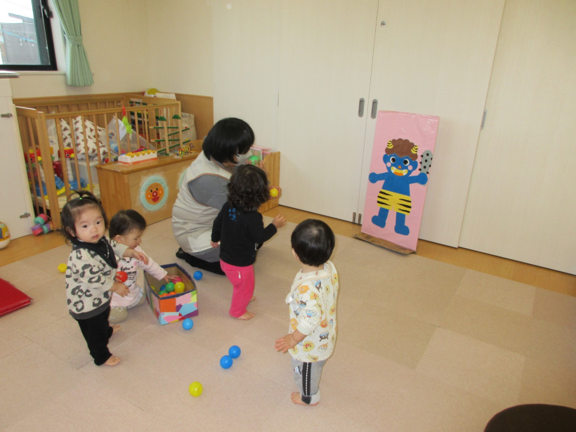 節分当日は鬼のパネルにボールを投げて雰囲気を楽しんでいました。