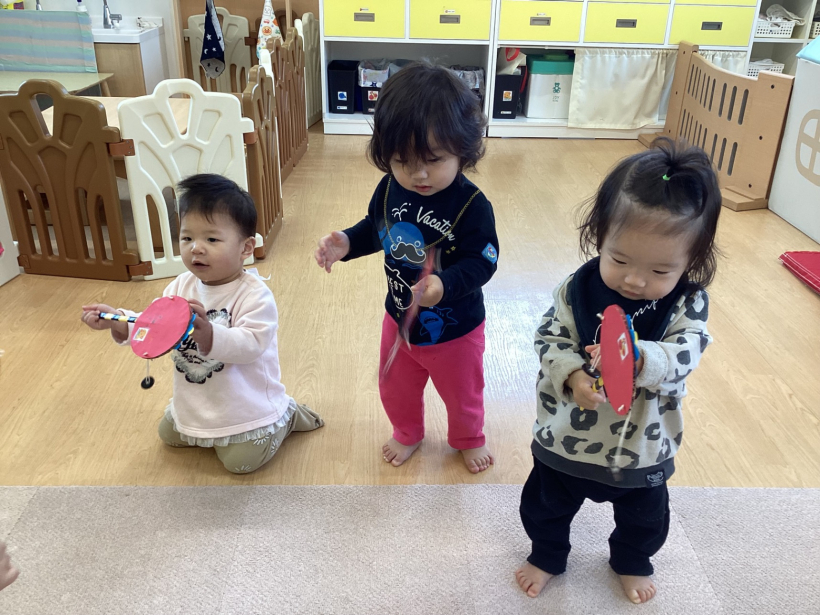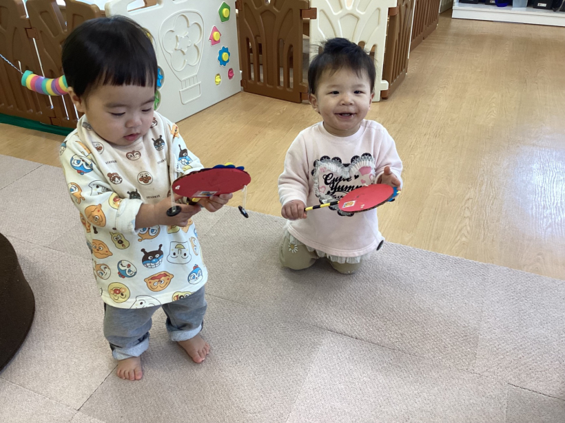 なぐりがきをして遊びました。それを使ってでんでん太鼓を作ると、音を鳴らして嬉しそうに遊んでいました。