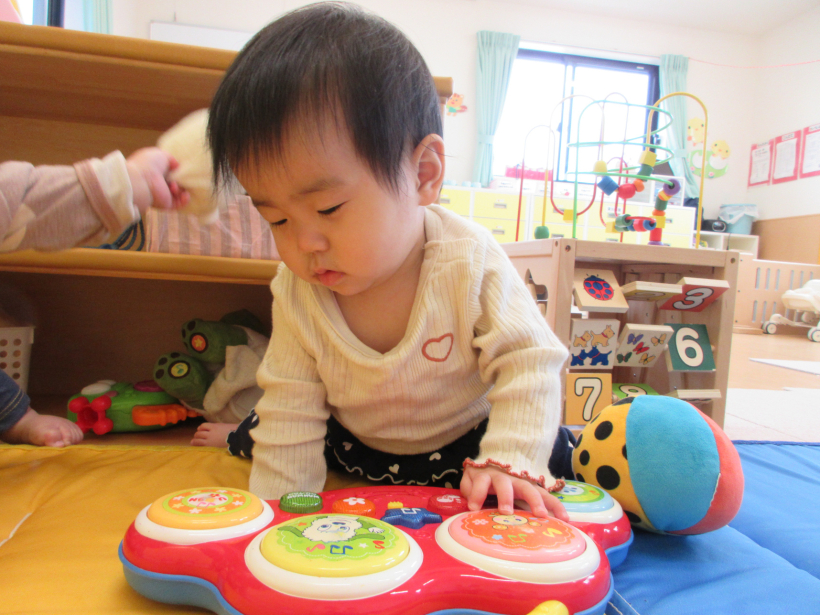 お気に入りの音のなる玩具では、ボタンを叩いて音を鳴らしたり、保育者に鳴らしてもらいながら楽しむ姿が見られています。