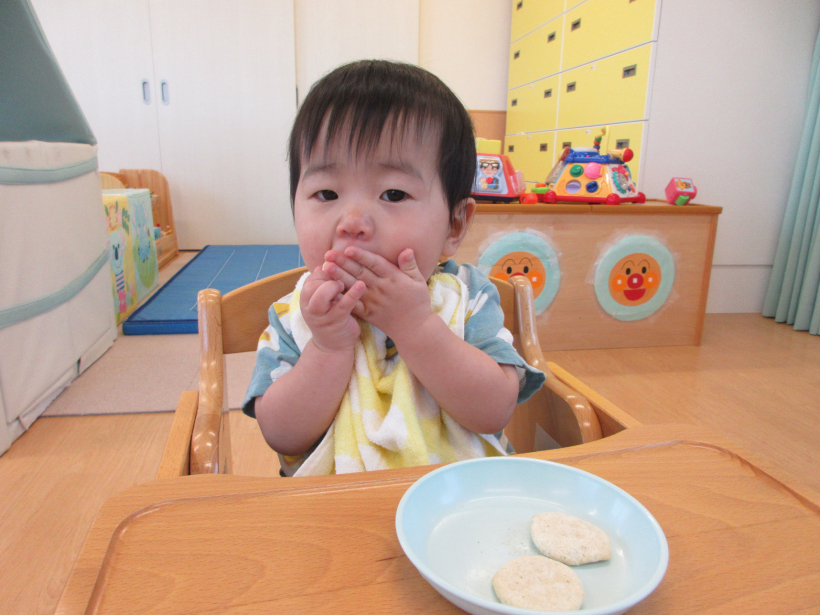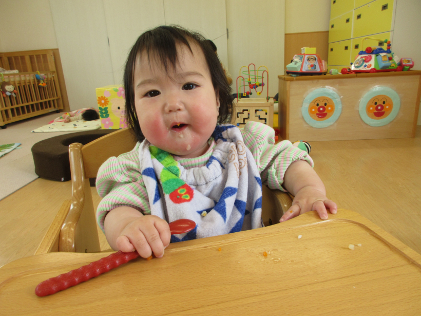 おやつや給食の時間には、自分で手に持ち食べ進めるかわいらしい姿が見られました。