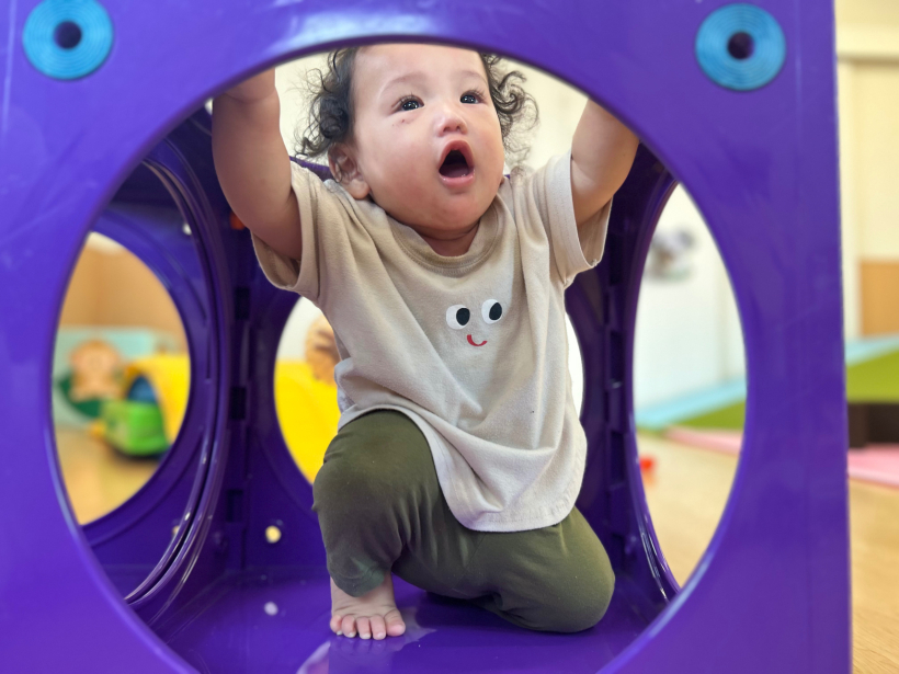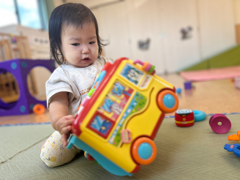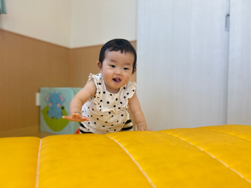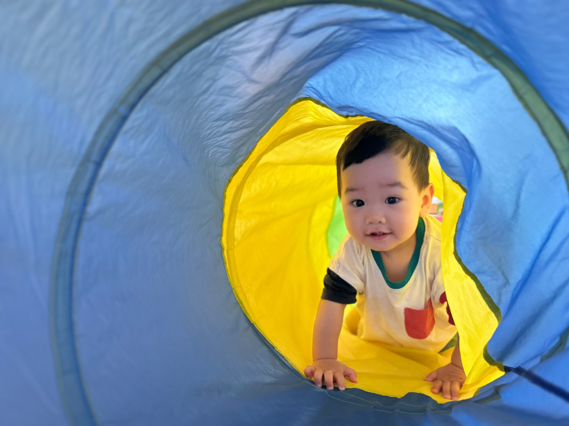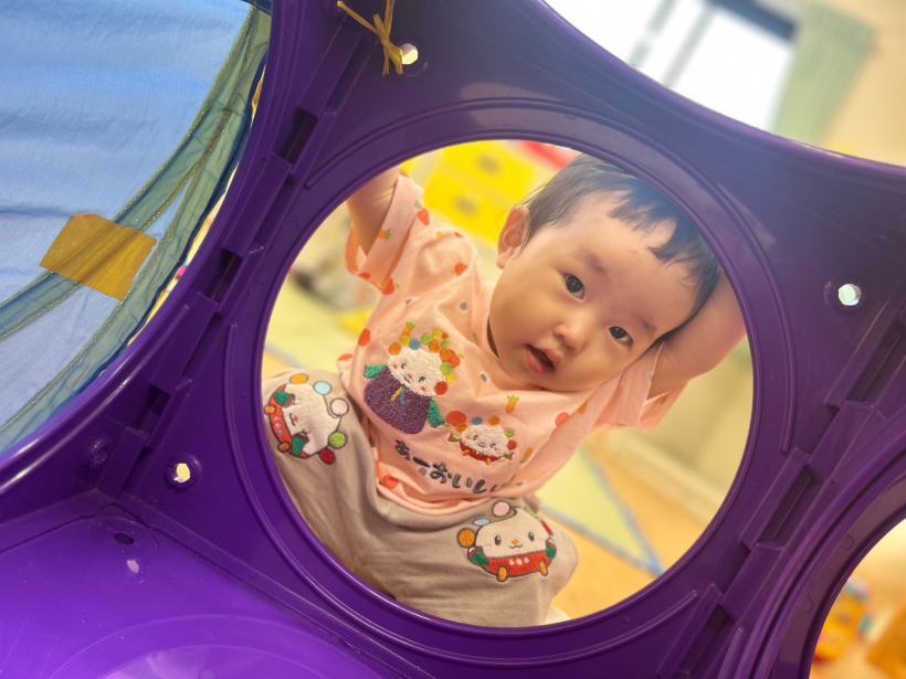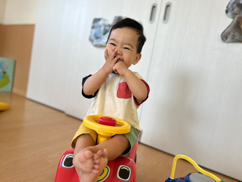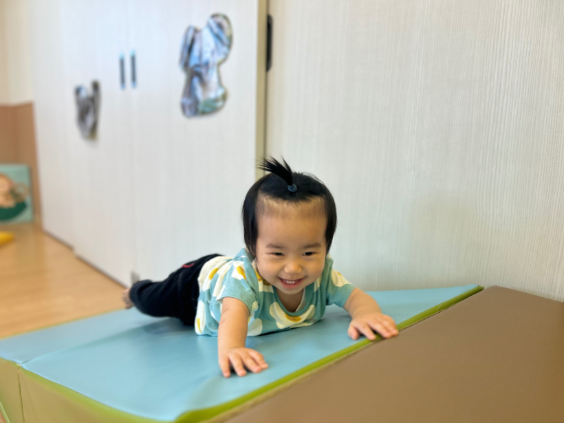 ひよこ組 クラスニュース【6月】 今月は保育室の模様替えをして、運動スペースが広がったことで、様々な運動遊びを楽しむ姿が見られました。 トンネルをくぐったり、坂道をハイハイで一生懸命登ったりと十分に体を動かして楽しく過ごすことができました。 最近は「いないいないばあ」が流行っていて、保育者の声に合わせてさまざまな影から「ばあ!」と言って可愛く出てきて、とても癒されています。 コンビカーに乗ったり、おもちゃで遊んで嬉しそうにする友だちもいました。 来月は水遊びを通して夏ならではの遊びを楽しんでいきたいと思います。