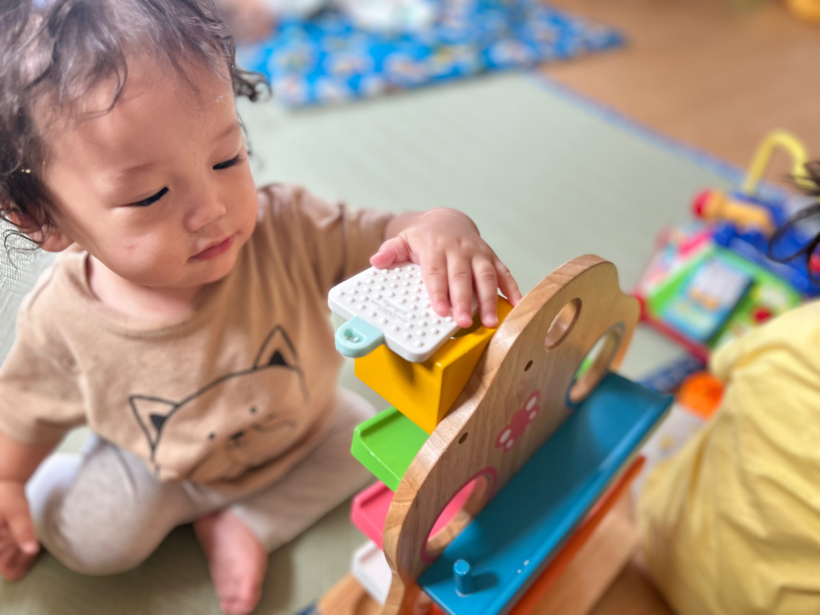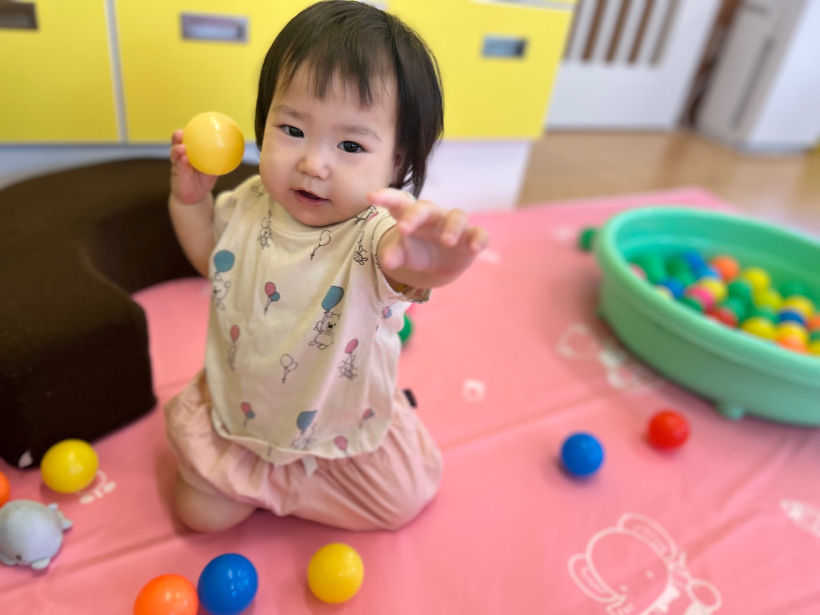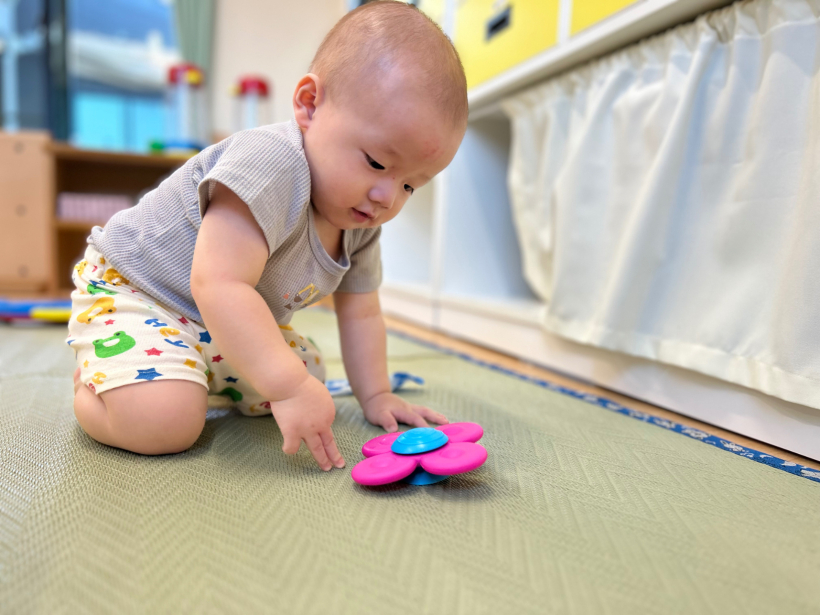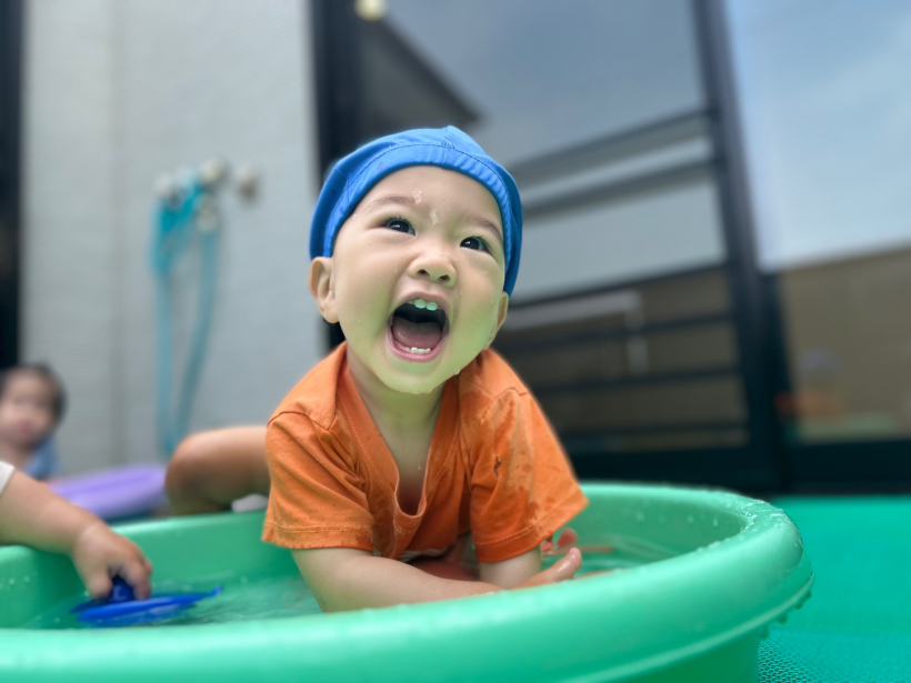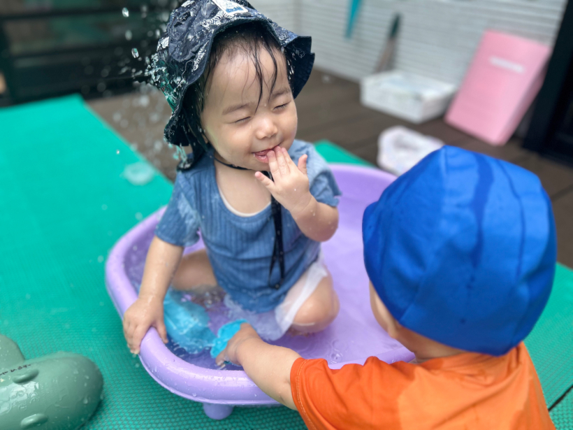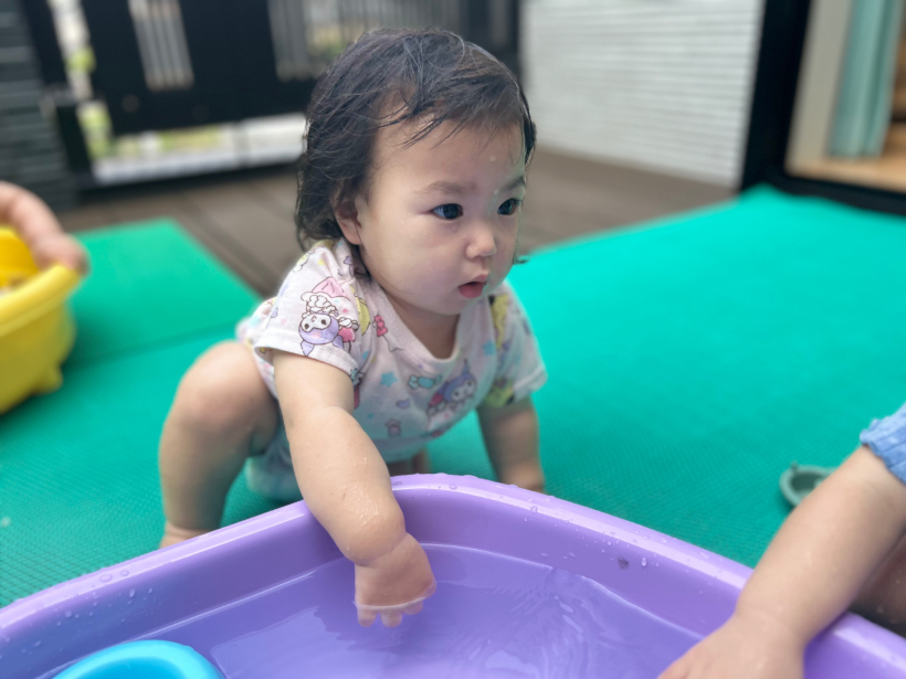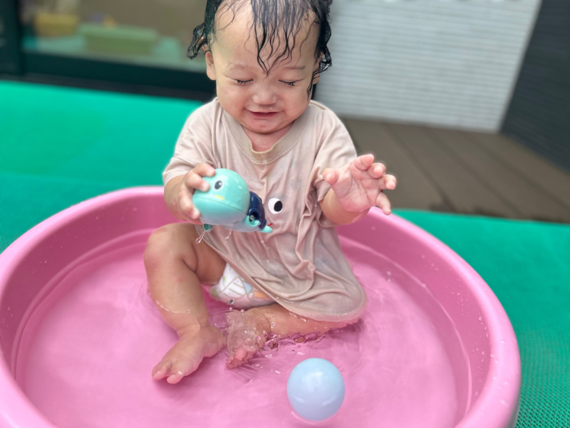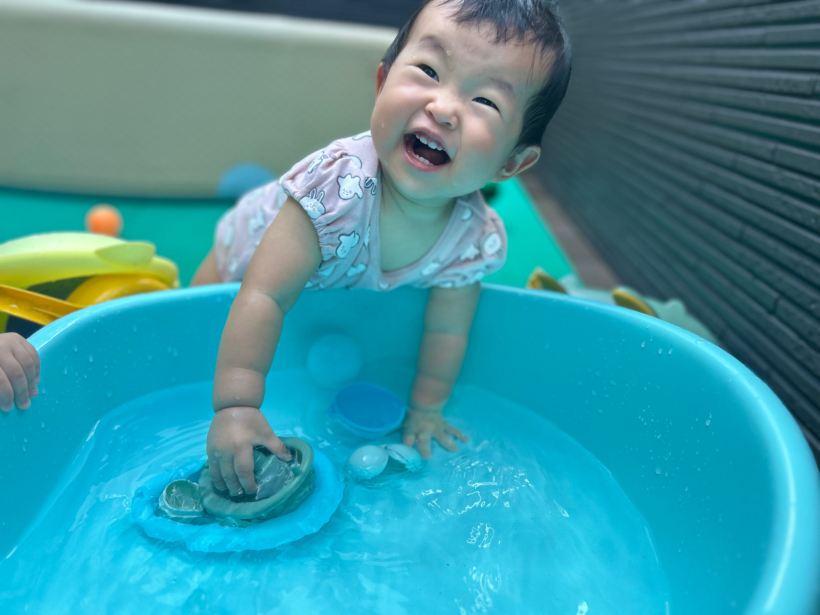 水遊びでは、冷たい水を気持ちよさそうに触ってみたり、タライの中に自分から入ってみたりと、夏ならではの遊びをダイナミックに楽しんでいます。