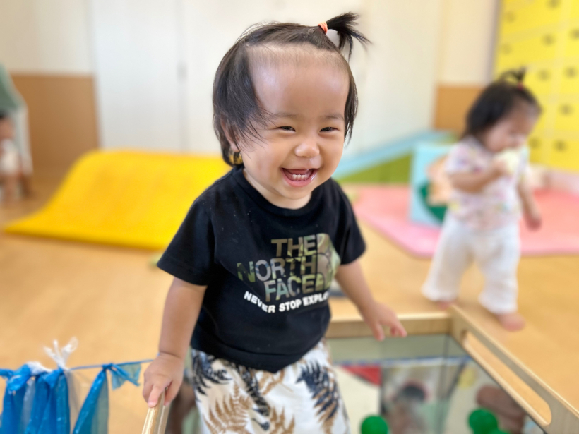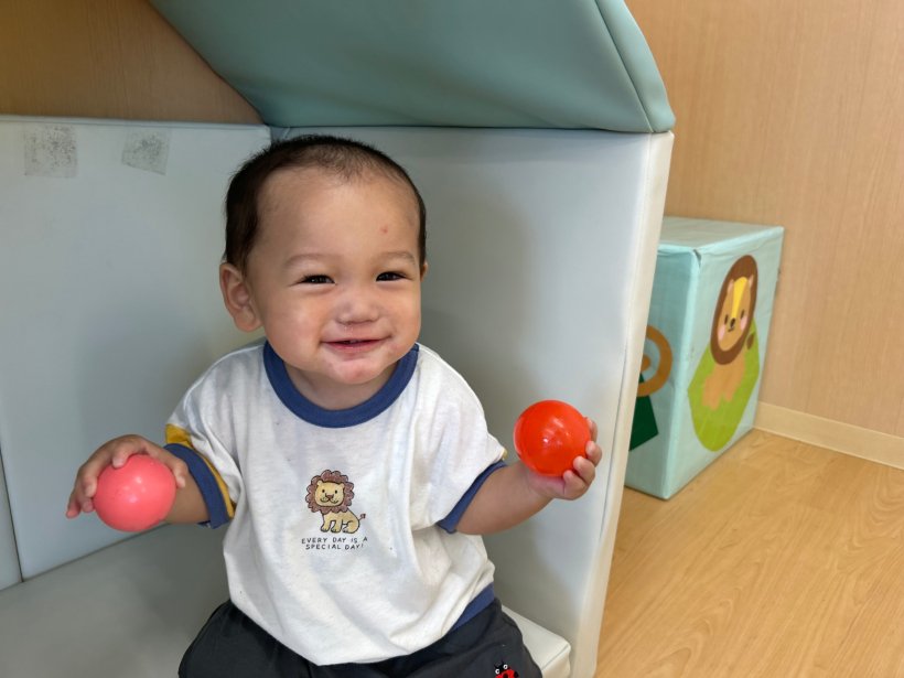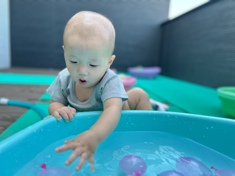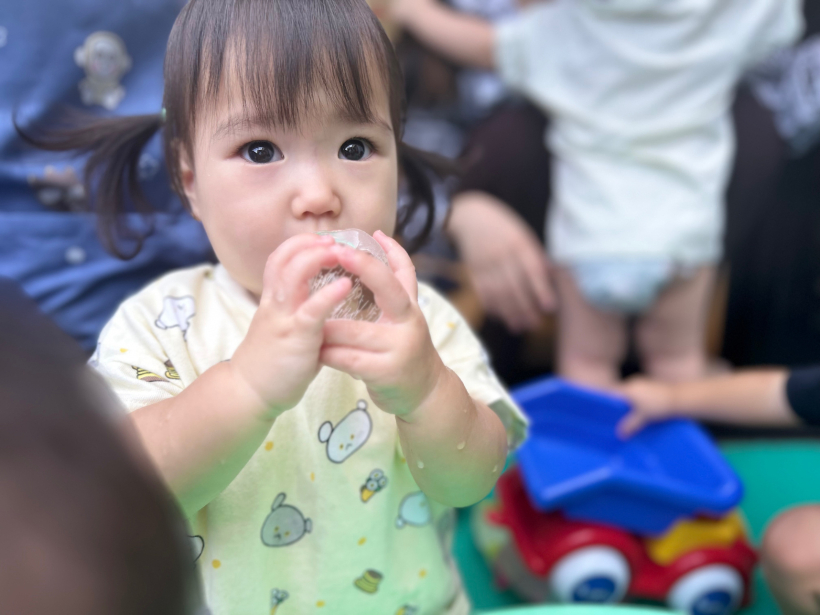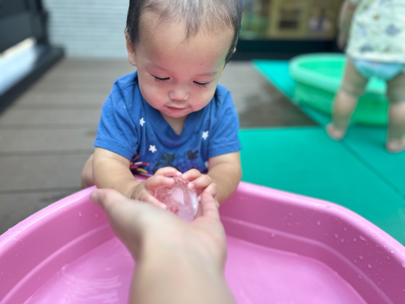 ひよこ組 クラスニュース【8月】 8月は水遊びに加えて、様々な感触遊びをして楽しく過ごしました。 初めての水風船遊びでは柔らかい感触に真剣な表情を見せる姿が見られました。 水風船の感触を楽しんだ後、水の中に投げ入れると… 両手を挙げて「わー」と嬉しそうな姿が見られました。 氷遊びでは、冷たい氷に触れて楽しく遊びました。 最近は表情も豊かになってきて、笑ったり泣いたり、真剣も表情が見られ、とても可愛らしく、成長を感じる毎日です。 来月も楽しく過ごしていけるように、様々な遊びを行なっていきたいと思います。