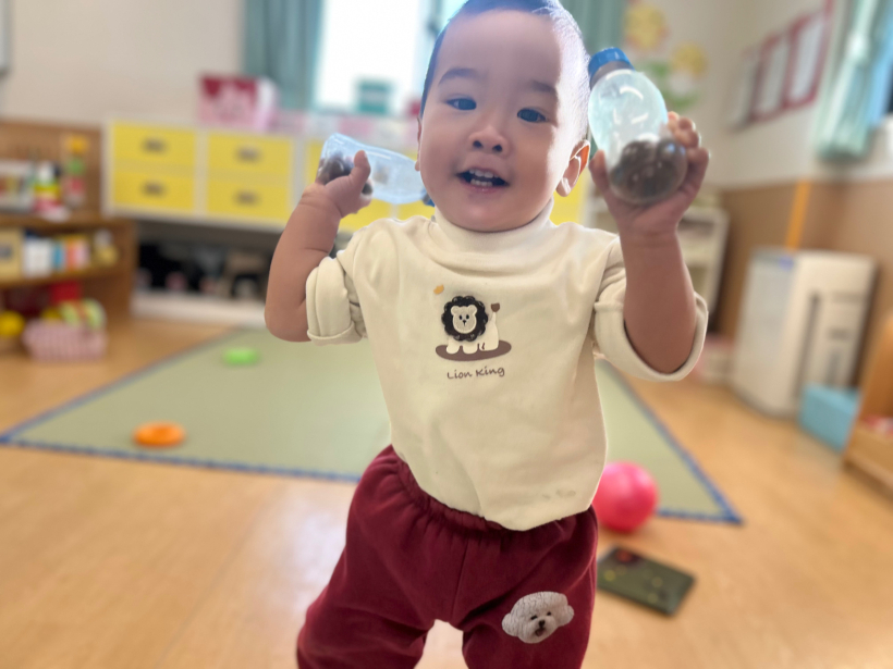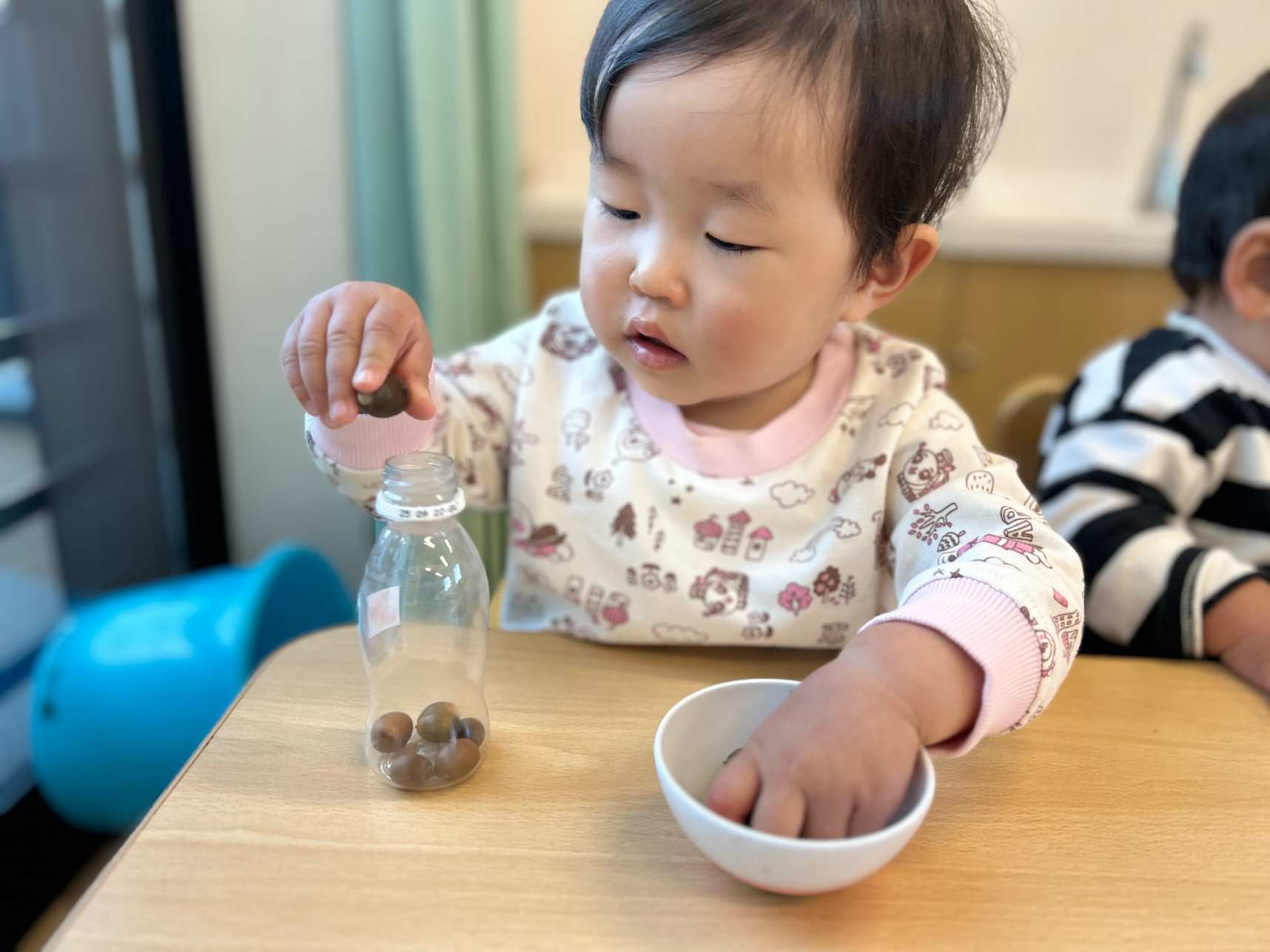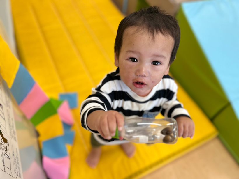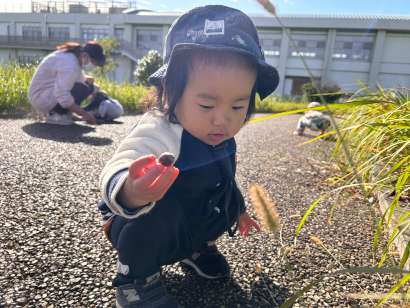 散歩先で見つけたドングリを拾って、マラカスを作り「どんぐりコロコロ」などの歌に合わせてリズム遊びも楽しみました。