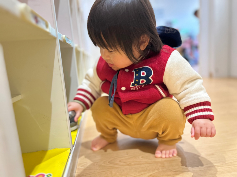 朝おやつ後、身支度をして玄関へ向かうと、自分の靴を見つけて保育者のもとへ持ってくる姿が見られます。