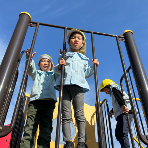 園庭遊びでは、築山の上で一休みしたり、テラスでのんびり図鑑を見たり...