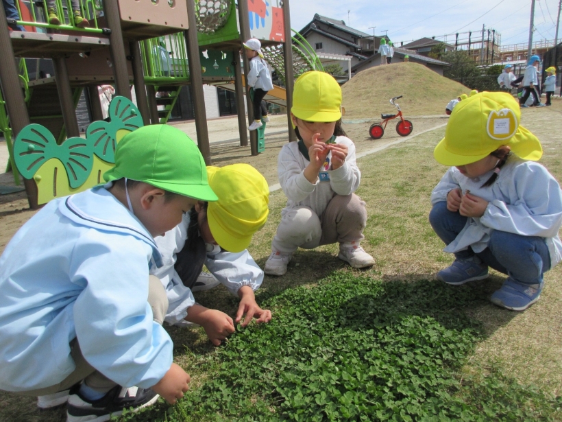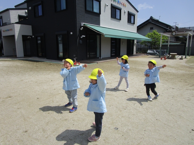 「だるまさんがころんだ」が、子どもたちのマイブームで、だるまさんが振り返った時は、面白いポーズでピタッと止まっています!また、滑り台や三輪車をしたり、友だちと園庭を探索したりと思い思いに好きな遊びをしています。