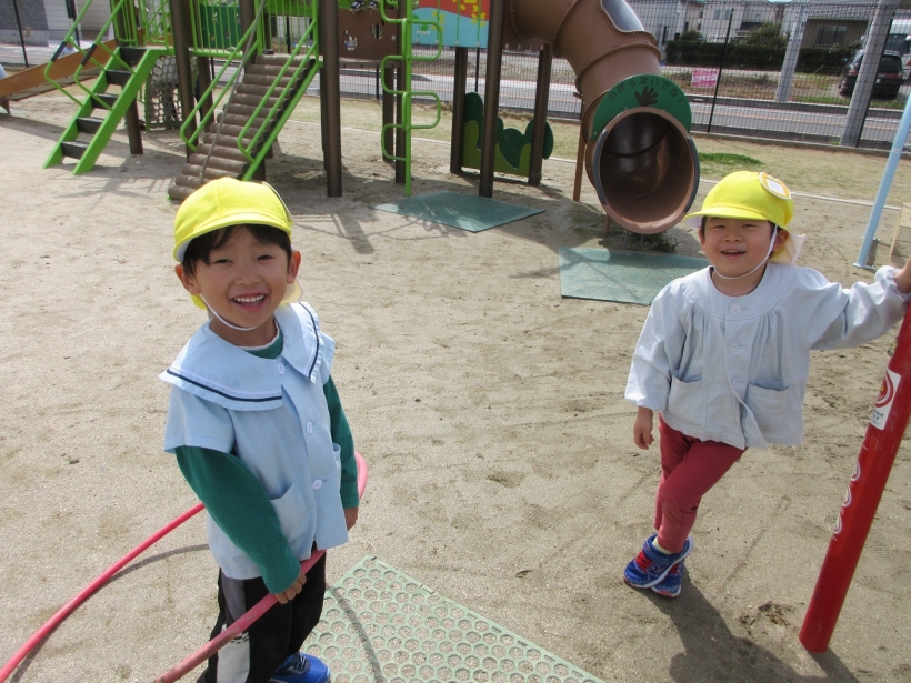 天気の良い日は、黄色の帽子を被って戸外遊びを楽しんでいます。