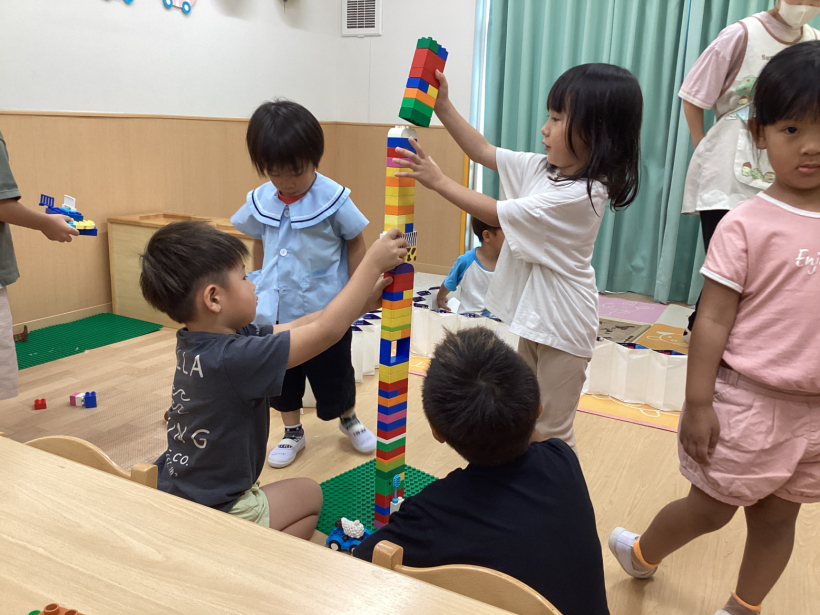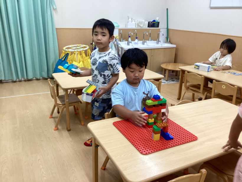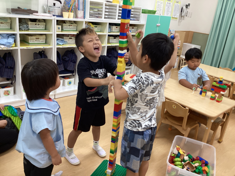 友だちと一緒にレゴブロックを高く積み上げて、倒れると、「きゃー」言って喜んだり、