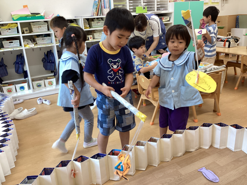 子どもたちが魚の絵を描いて、竿と海を作って、夢中になって楽しんでいました。