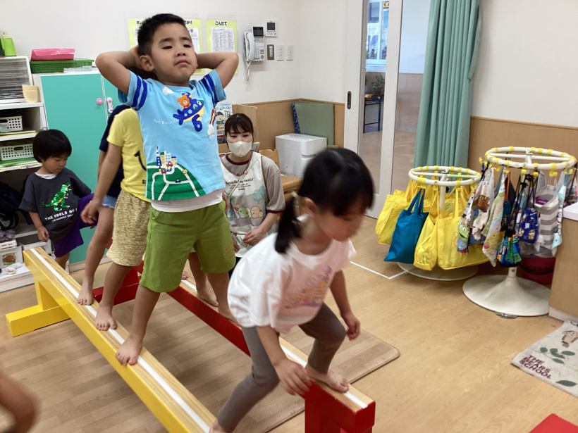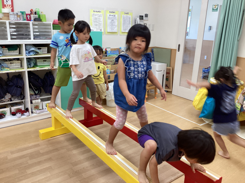 平均台を2本並べてその上を歩き、最後はかっこよくジャンプして降りていました。