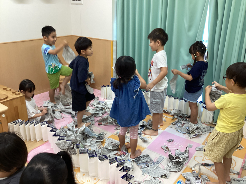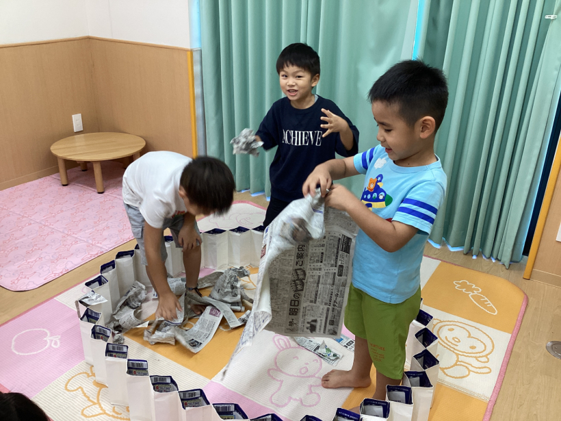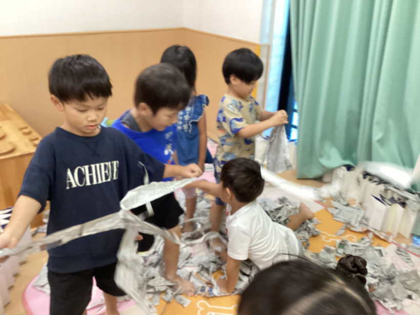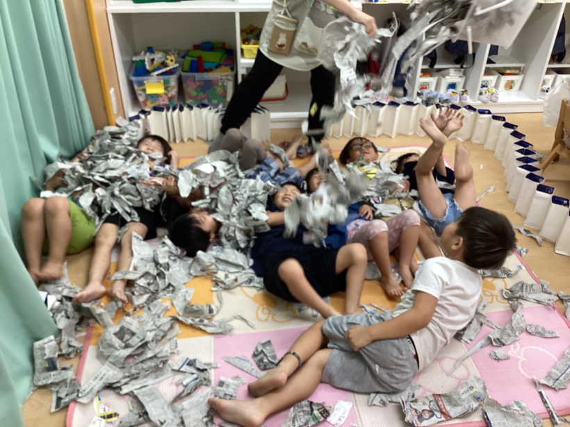 最初は3人で始めた遊びですが、どんどんやりたい子が増えて、新聞紙をビリビリ破って上に投げたり、布団のようにかけたりして楽しんでいました。