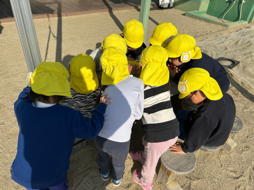 久しぶりに幼虫を見つけて、みんなで興味津々でのぞいていました。