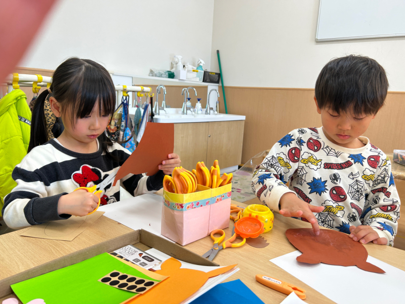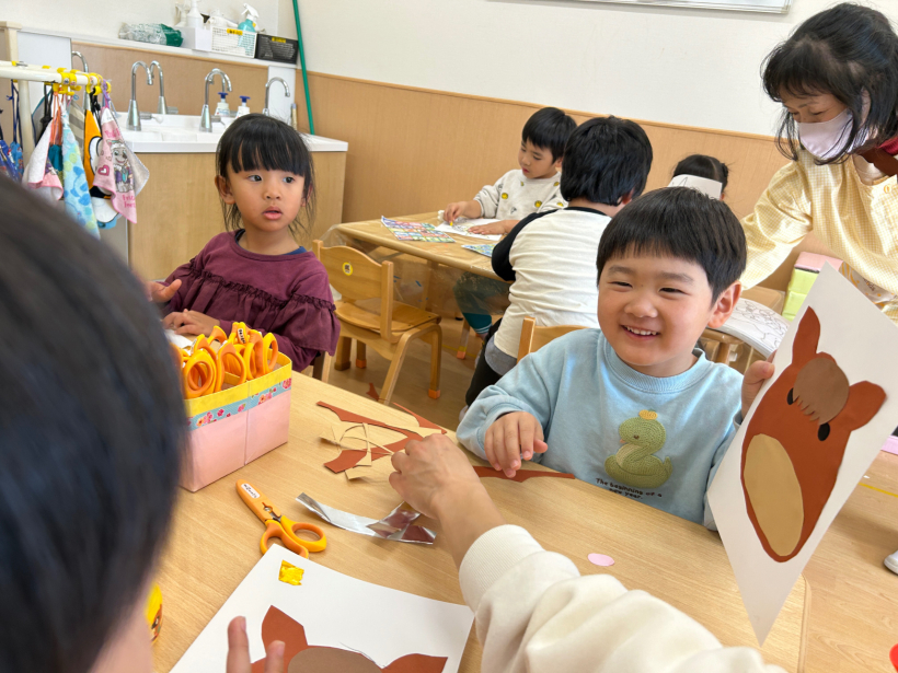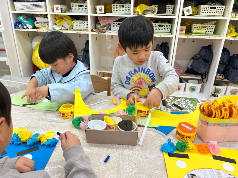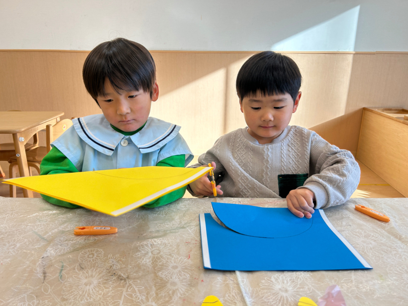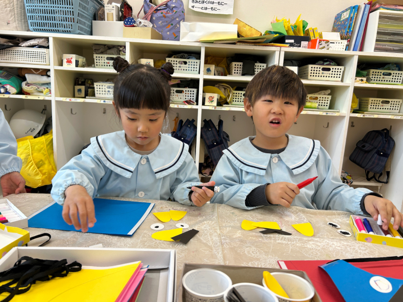 好きな色の画用紙を選び、ハサミで切ったりのりで 貼ったり楽しく作っていました。