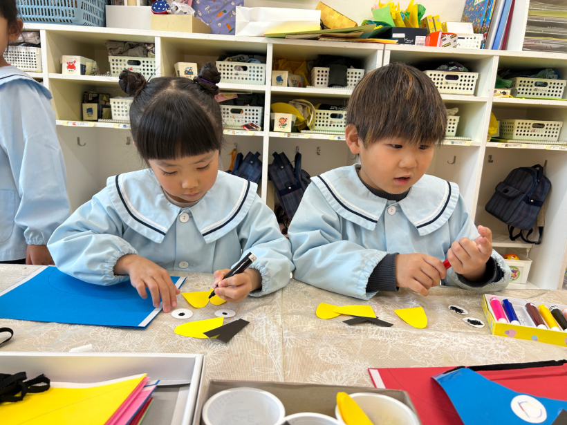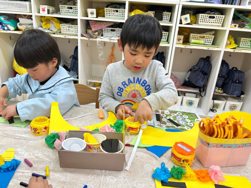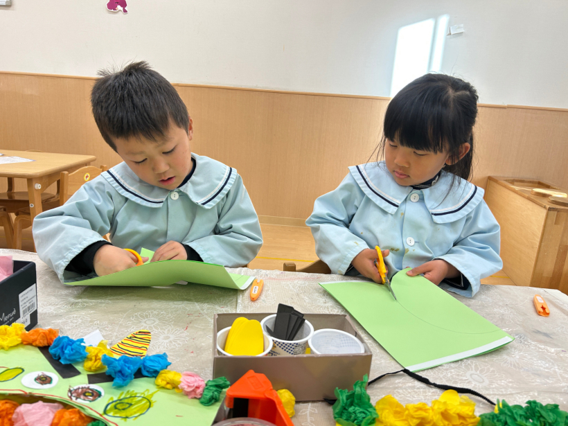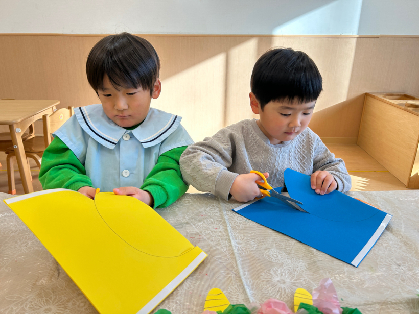 節分に向けて「おに」のお面の制作をしました。「なにいろのおににしようかな〜」と自分の好きな色に決め、ハサミで切ったり、お花紙を丸めて髪の毛にしたり、完成すると早速かぶって楽しんでいました。