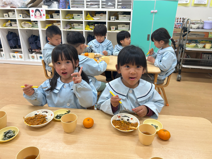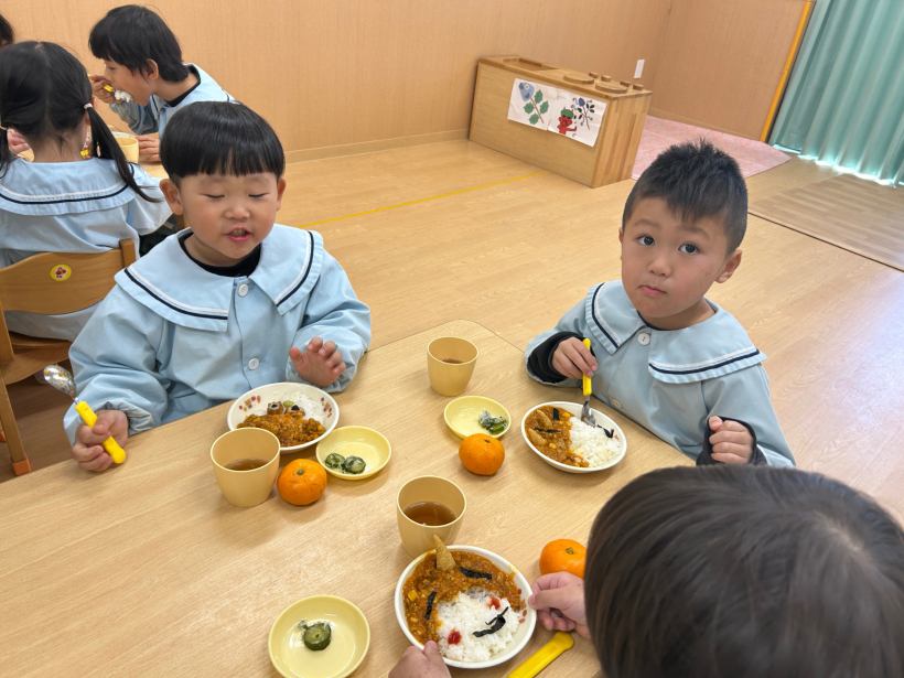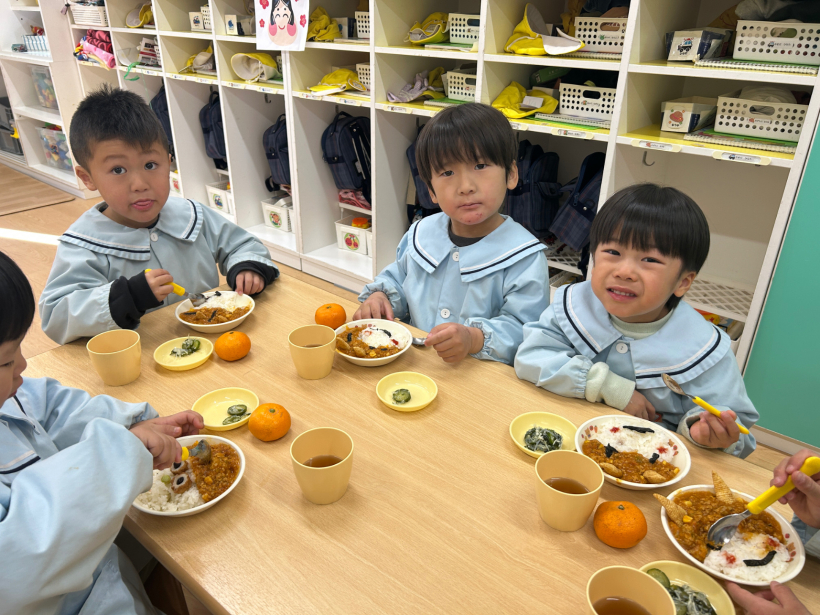 節分の日の給食は、子どもたちが楽しみにしていた「おにライス」とんがりコーンの角を自分でトッピングしてかわいいおにライスの完成!「どこからたべようかな〜」と嬉しそうに食べていました。