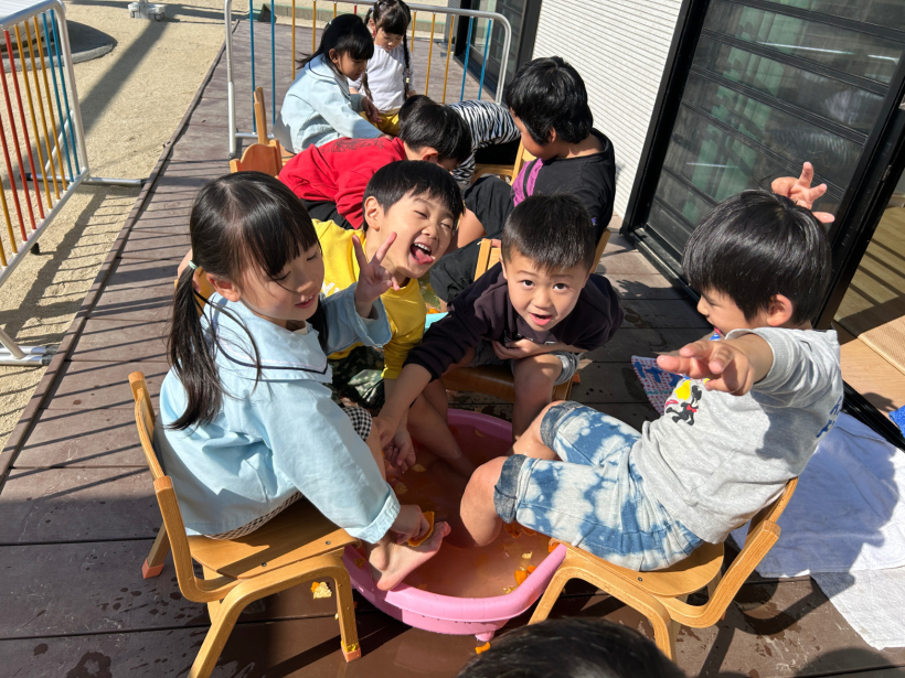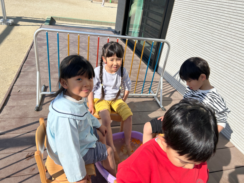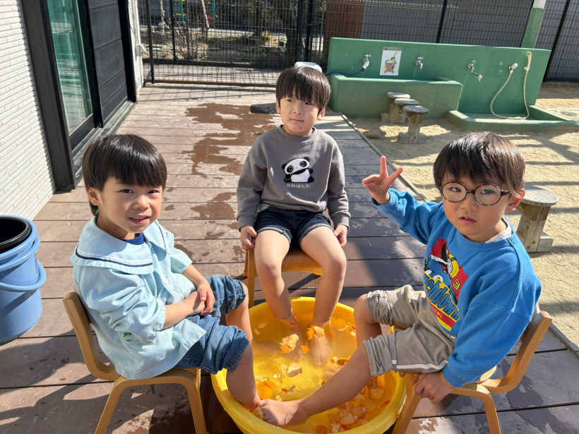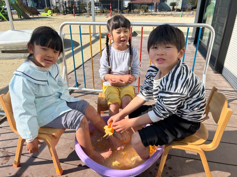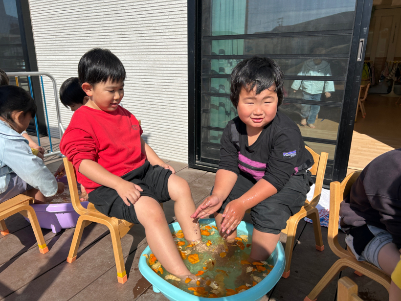 「あったかいね〜」「きもちいいね〜」と言いながら、みかんの皮を手に取って「いいにおい〜」と足湯を満喫していました。