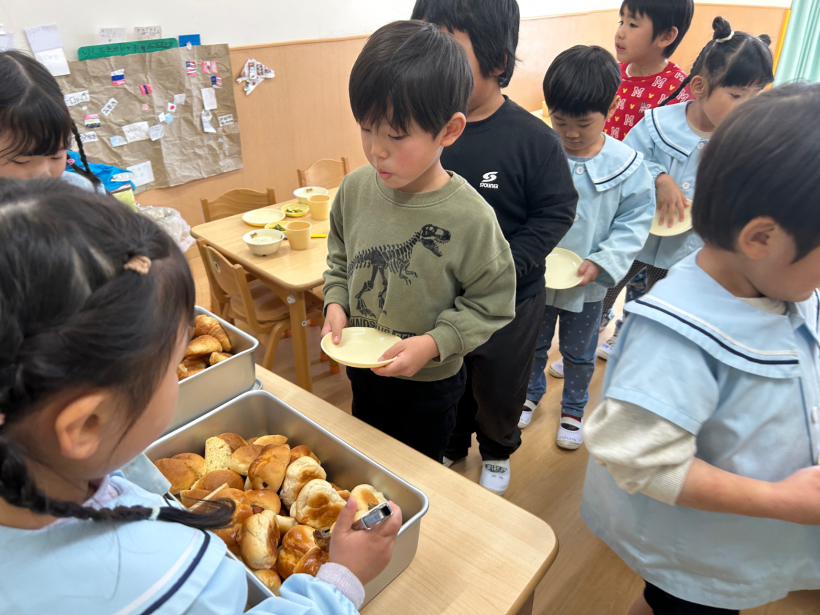 子どもたちに大人気のパンバイキングの日、ぞう組の友だちがパン屋さんになって来てくれました。お皿を持ってパン屋さんに並び「パンください」とパンを選んでいました。