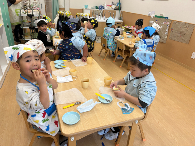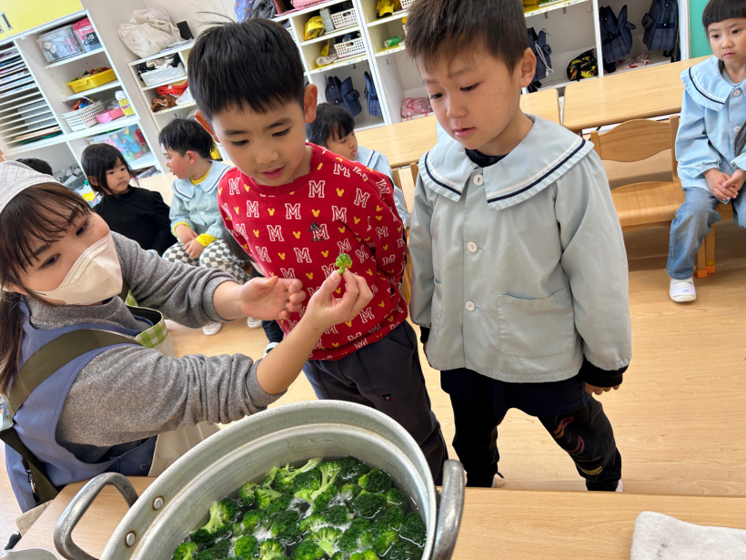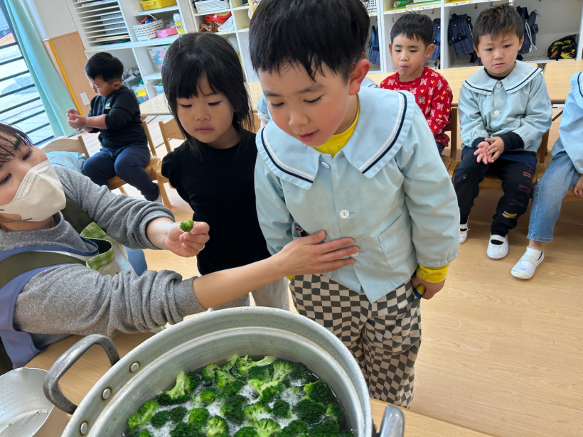 茹で上がったブロッコリーに、オーロラソースをつけ、「おいしいね!」と言いながら、取り立て新鮮な美味しさを味わって、いつもは食べない子もパクパク食べていました。