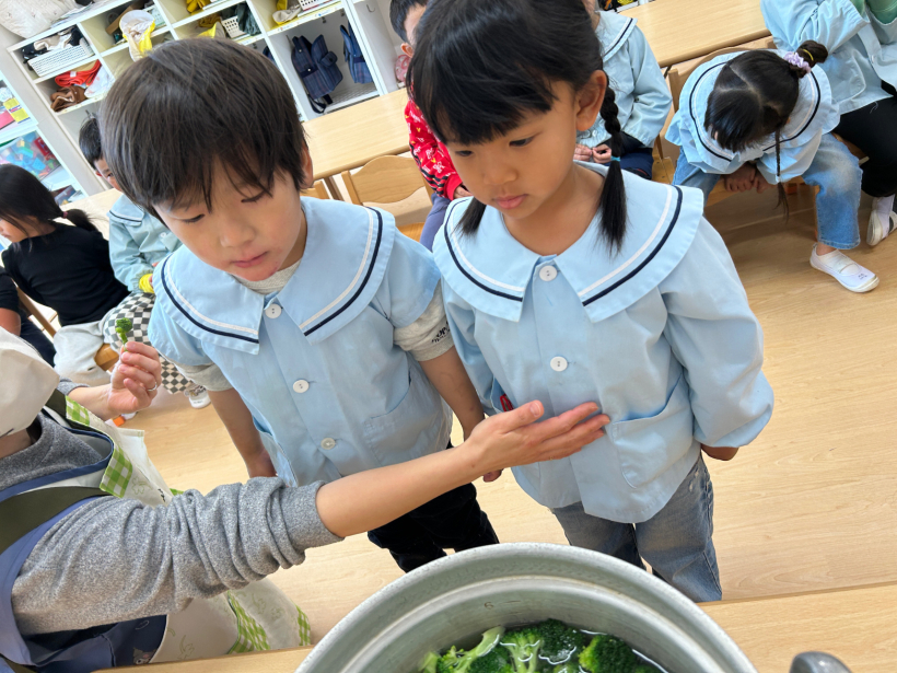 収穫したブロッコリーは部屋で茹で、匂いを嗅いだり、色の変化を比べたりしました。