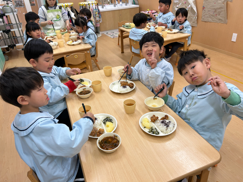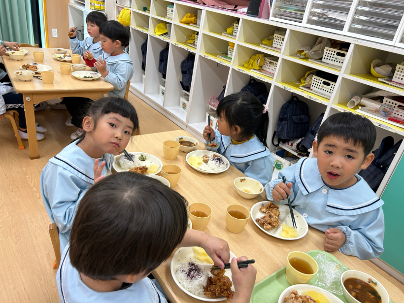 唐揚げ、ゆかりご飯、パイナップルなどきりん組の子どもたちも好きなものばかりで、大喜びで食べていました。