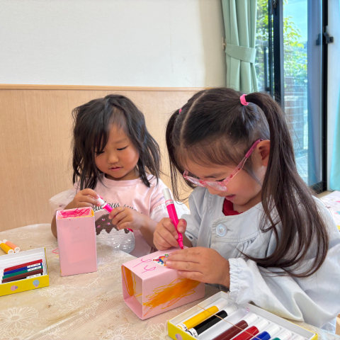ぱんだ組になり、自分のクレヨンや粘土で遊ぶことを楽しんでいます。 園...