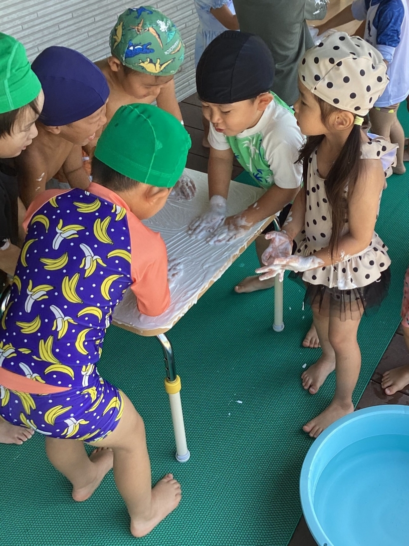 洗濯糊やほう砂水などを混ぜて作るところを興味津々で見て、スライムができると手でこねたり、机の上で伸ばしたり、そこに指で絵を描いたりして、感触を楽しんでいました。
