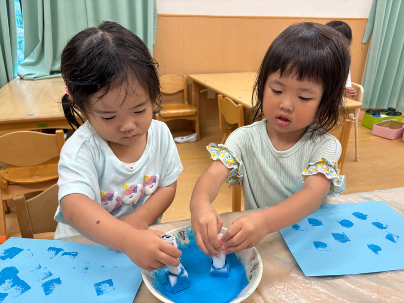 前回の製作で絵の具を使うことを楽しんでいたので、絵の具を使ったスタンプをしました。