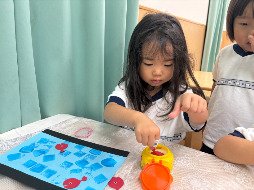 きんぎょは、のりで貼りました。一列に揃えて貼る子やランダムに貼る子など個性が出ました。