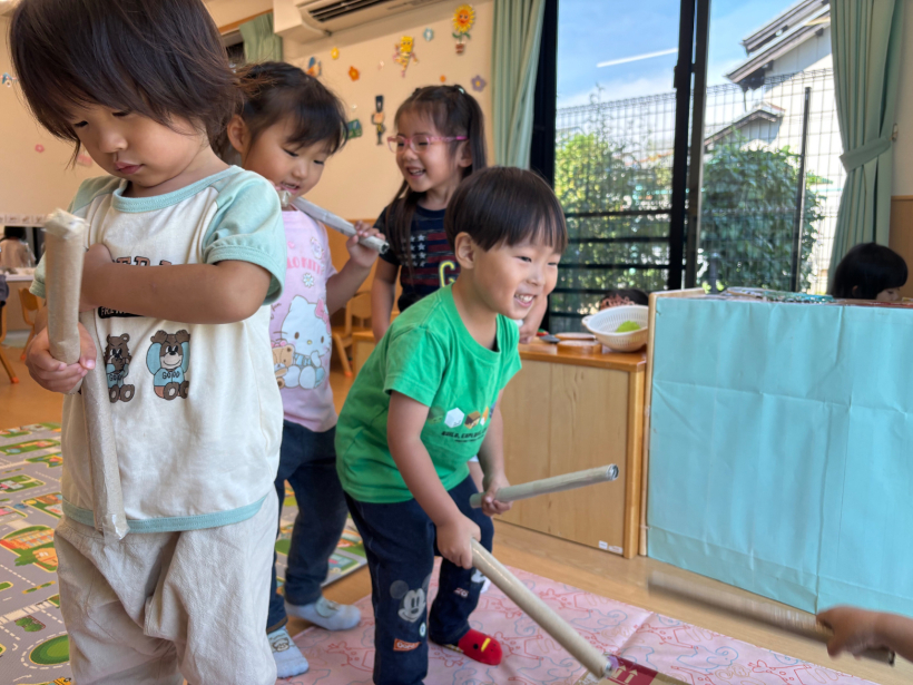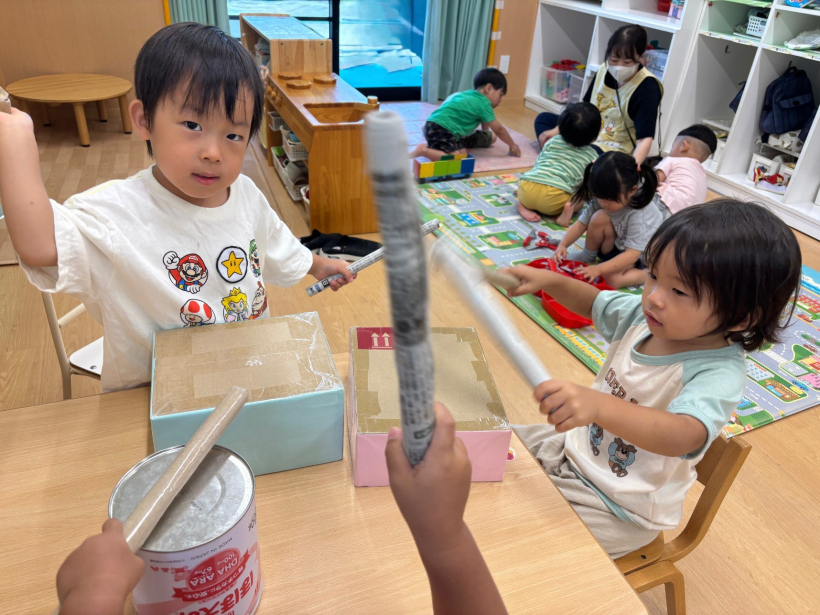 夏まつりが終わってから、ぞう組の太鼓を真似して遊んでいます。