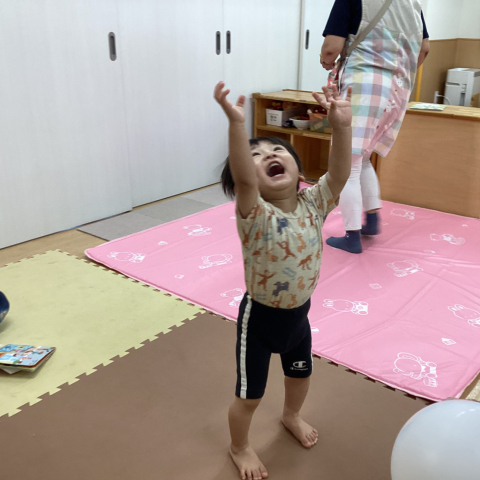 風船遊びをしました。 保育者が膨らませている様子を興味を持って見てい...