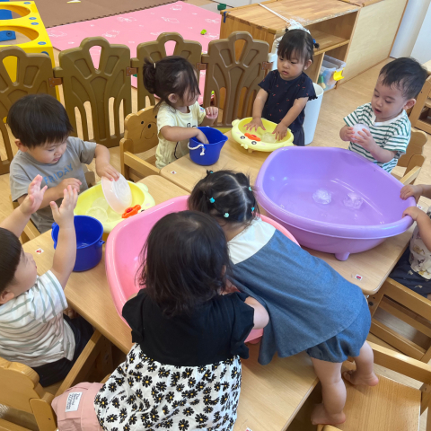 氷遊びをしました。 「つめたーい」と言いながら握ったり、腕に当てたり...