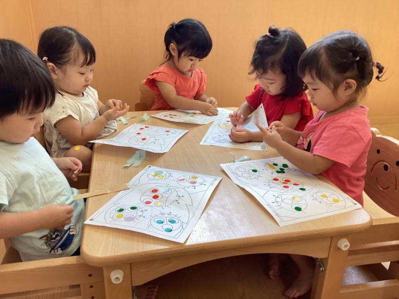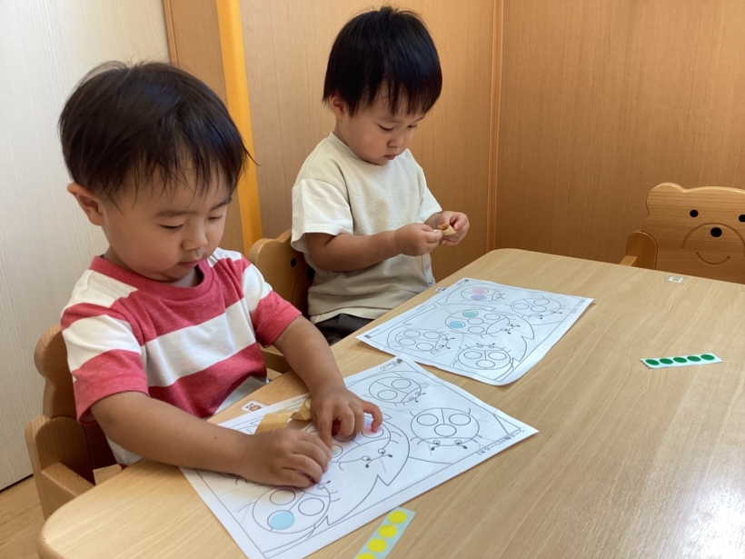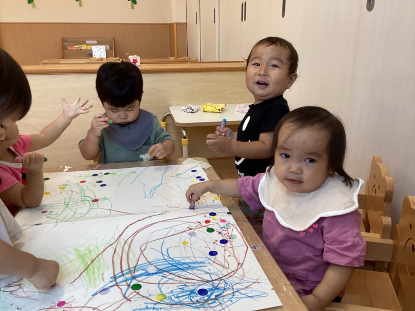 シール遊びでは、大きめのシールだけでなく、少し小さいシールもはがして貼れるようになったり、クレヨン遊びでもダイナミックに描いて楽しむ姿が見られたりして、成長を感じました。