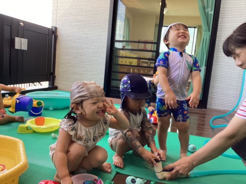シャワーで噴水のようにすると、にこにこ水に触れたり、顔にかかると「きゃ~」と楽しんでいる姿が見られました。