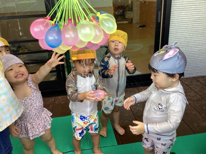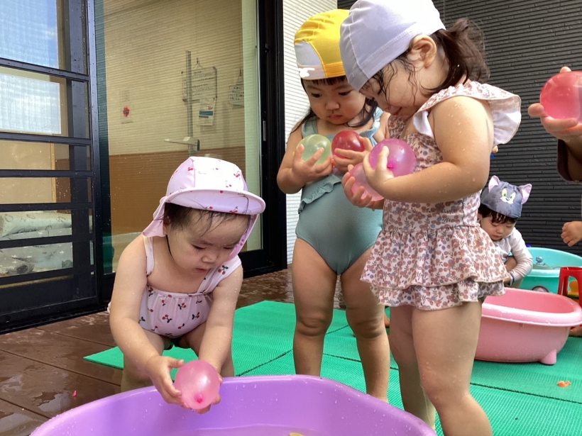 水風船に水が入り、膨らんでいく様子を目を輝かせて見たり、割れないようにそっと持ったりして楽しんでいました。