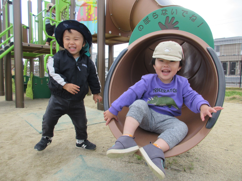 最近の園庭遊びの流行はトンネルの滑り台です!