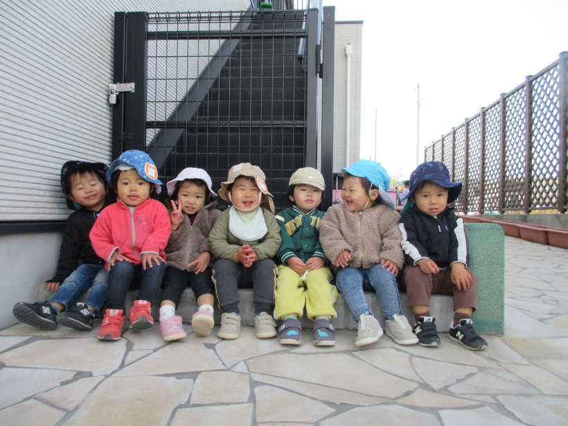 「散歩行こうね!」と伝えると、楽しみにする子どもたち。自然と集まって並んで座る姿に思わず写真を撮ってしまいました!
