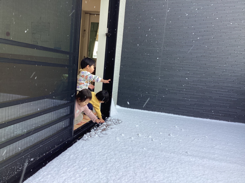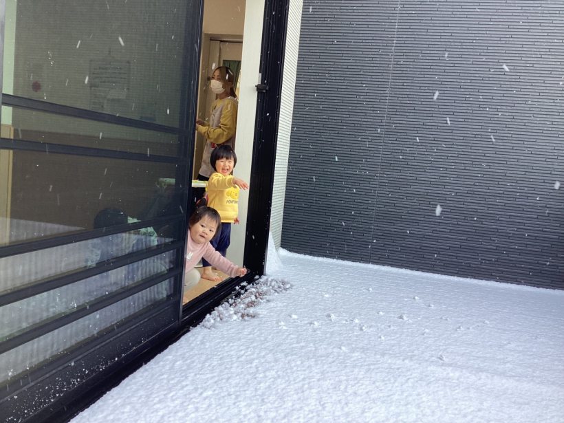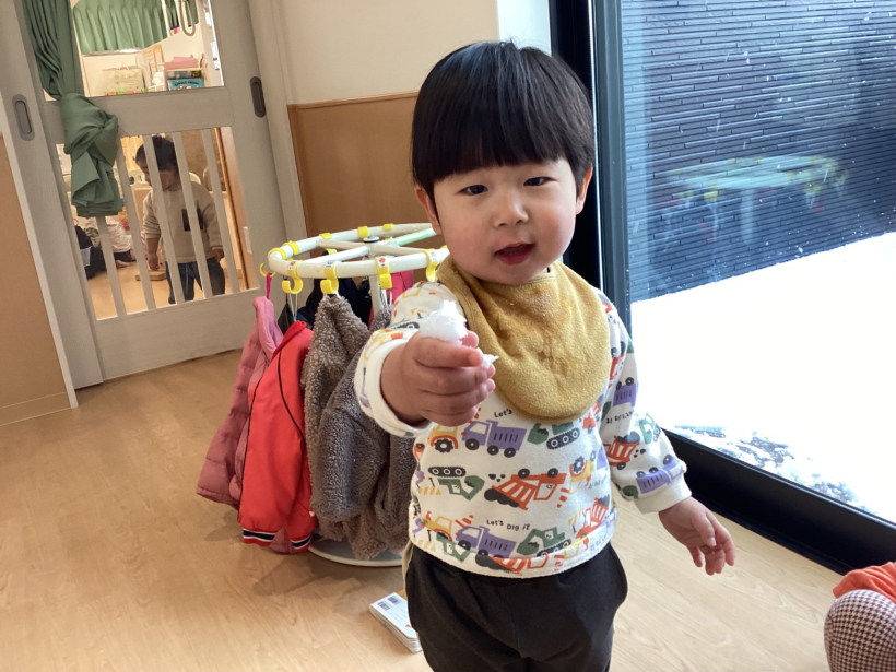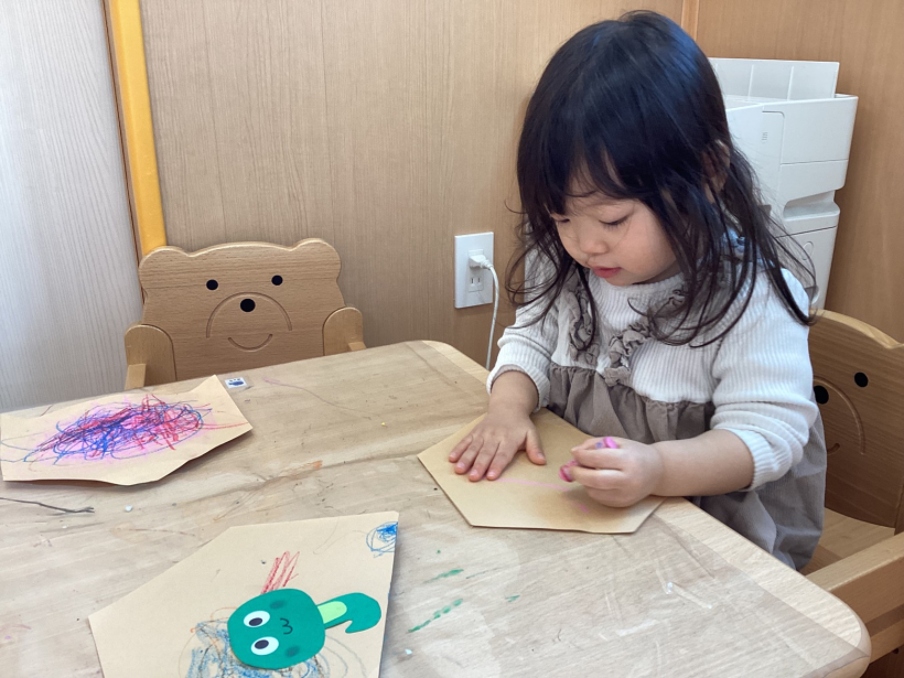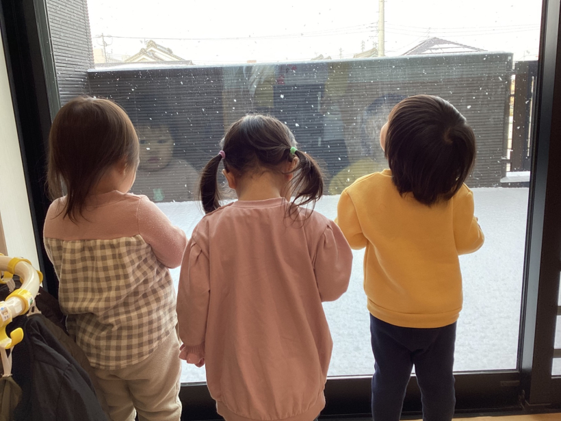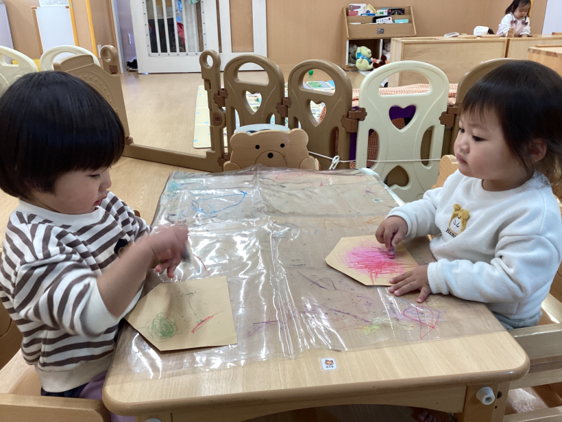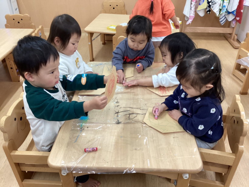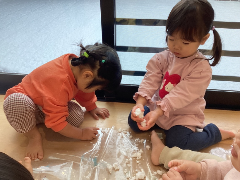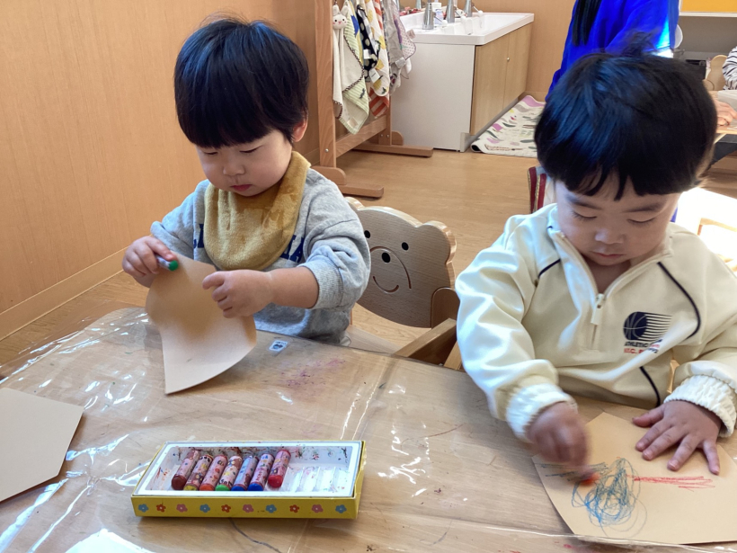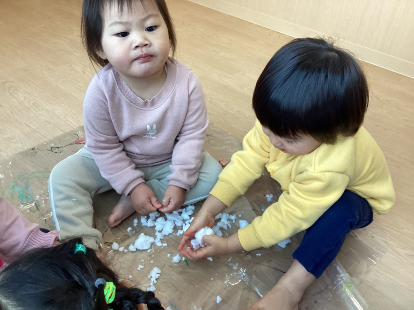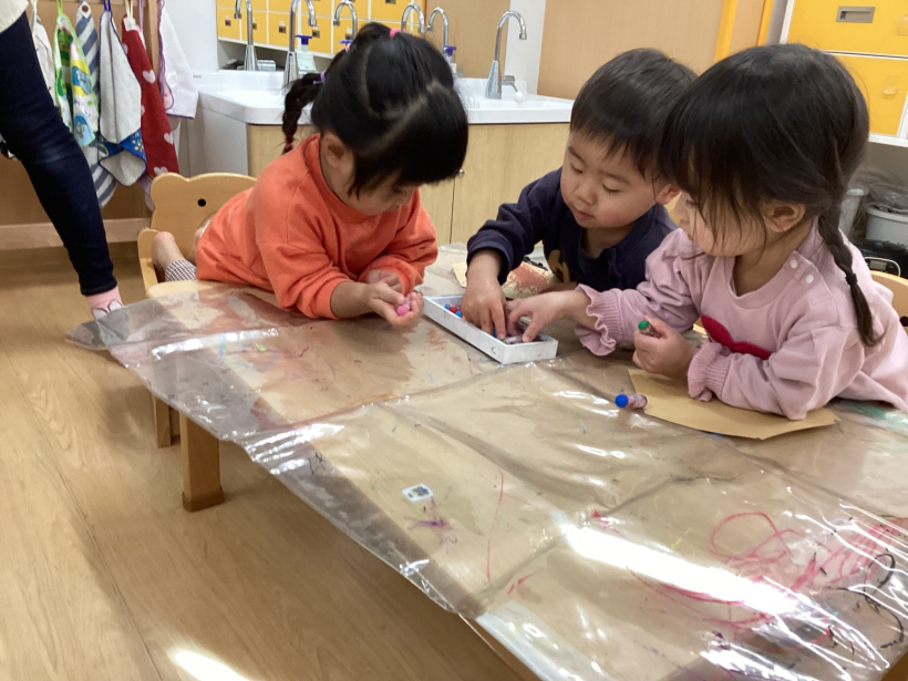 りす組クラスニュース【1月】 雪遊びでは、ちらちらと降る雪を見ていたり、雪の感触を手で触ったりして楽しみました。 絵馬作りでは、好きな色を選び、お絵描きをしました。 「ぴんく〜」と言って欲しい色を探したり、「できた〜」と言って見せてくれたりして、楽しんでいました。