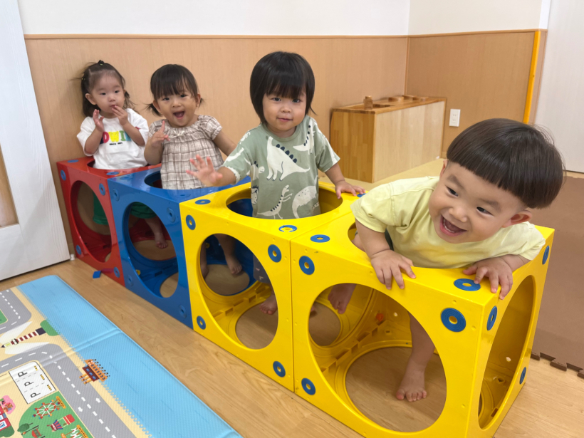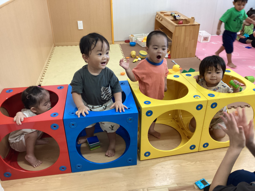 カラーボックスから顔を出して「ばぁ!」をしたり、ひとつずつのお部屋に入って楽しんでみたりと毎日楽しく遊んでいます。