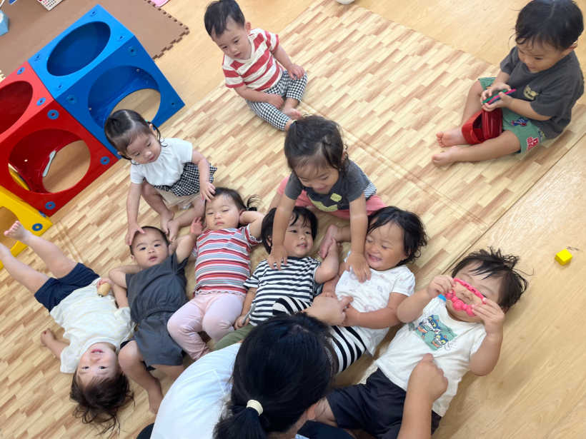 僕も!私も!と保育者の側にきて寝転がる子、保育者の真似をしてこちょこちょする子、その様子を側で見て楽しむ子など楽しみ方は様々です!